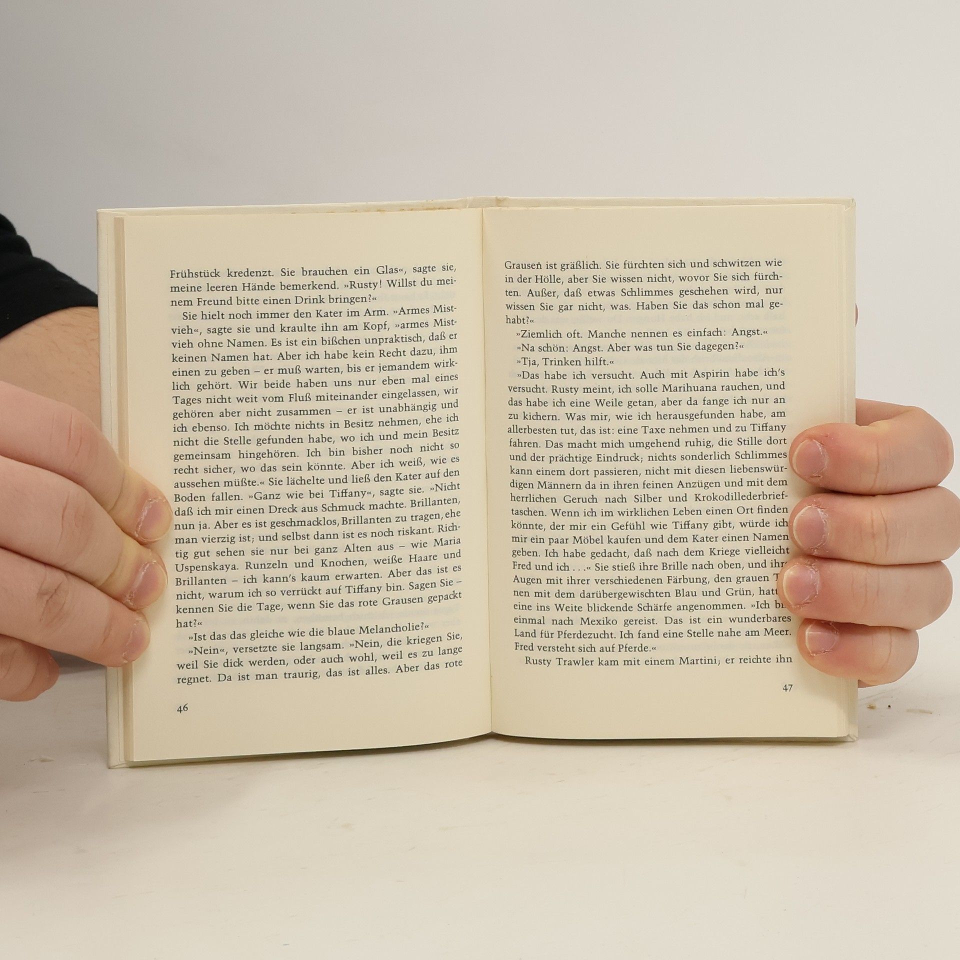 „Bei all ihrer schicken Magerkeit strahlte sie eine Haferflocken-Gesundheit aus, eine Seifen- und Zitronen-Reinlichkeit, und auf ihren Wangen lag eine raue Röte. Sie hatte einen großen Mund und eine Stupsnase. Eine Sonnenbrille verbarg ihre Augen. Es war ein Gesicht, das nicht mehr ganz in der Kindheit zuhause war und schon einer Frau gehörte.“ So beschreibt Truman Capote seine unsterbliche Heldin Holly Golightly. Die fast Neunzehnjährige, die voller Lebenshunger vom Land in die große Stadt ausgerissen ist, hat nichts außer ihrer Erscheinung und Ausstrahlung, die sie befähigt, mit Männern zu spielen und sich gewissermaßen aushalten zu lassen. Manchmal, im Partytrubel von New York, glänzt sie unschuldig, doch dann überkommt sie das „rote Elend“, das Gefühl von innerer Leere und Einsamkeit. In solchen Momenten flieht sie zur Fifth Avenue zu Tiffany, wo der Schimmer der Diamanten ihr Sicherheit gibt. Ihr Nachbar, ein junger Schriftsteller, beobachtet ihr aufregendes Leben und liebt ihre Schlagfertigkeit sowie ihre originelle Sprache. Gelegentlich spielt sie Lieder, die an Südstaaten-Nadelwälder oder die Prärie erinnern. Eines Tages ist sie plötzlich verschwunden, und zurück bleibt nur ihr namenloser Kater, auf dessen Suche sich der Erzähler begibt.