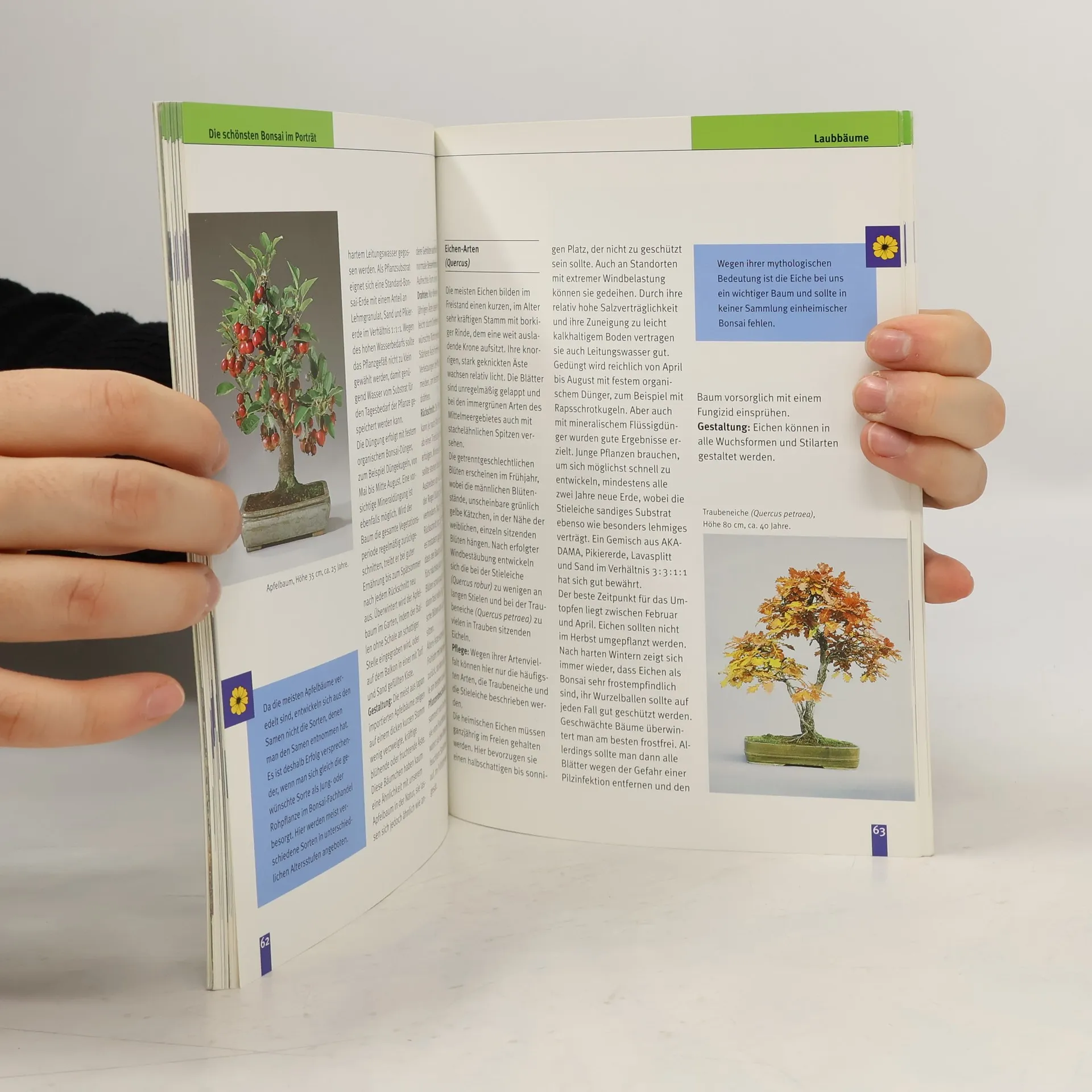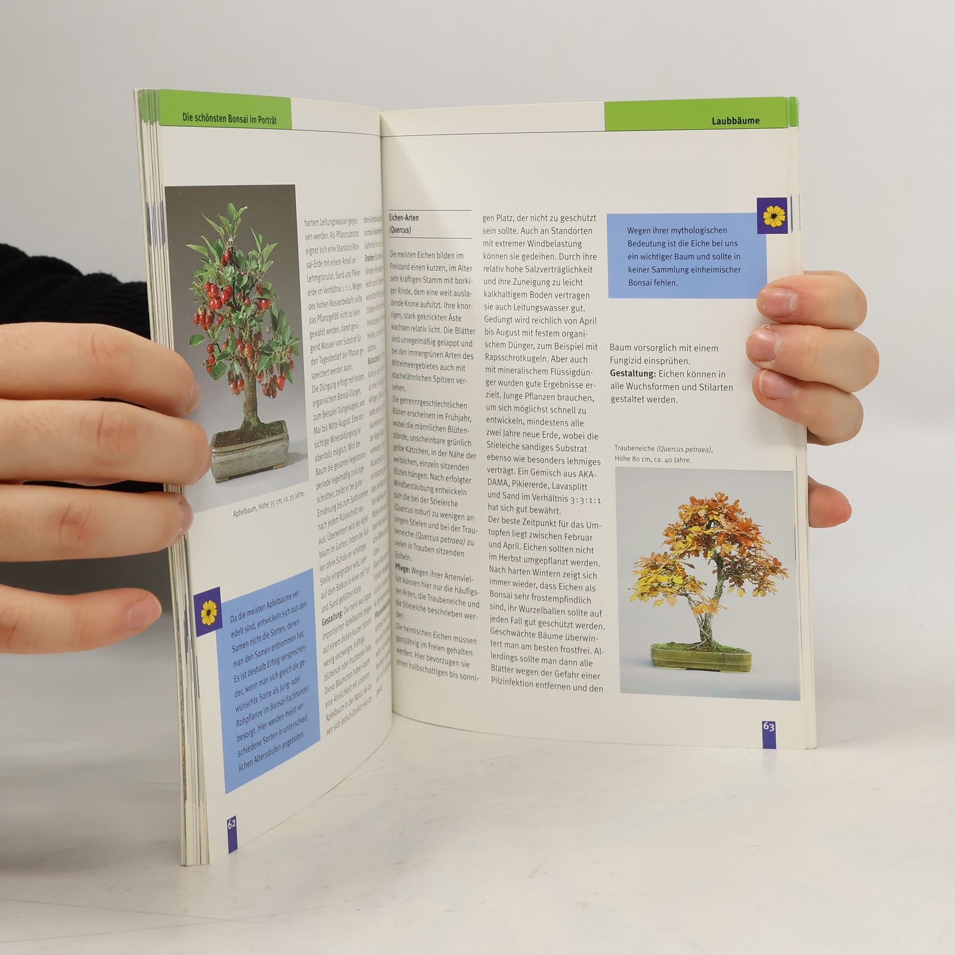 Pflege: Standort Freiland/Zimmer, Wasser, Erde, Dünger, Pflanzenschutz, Kauf und eigene Anzucht; Gestaltung: Werkzeug, Rückschnitt, Drahten; die schönsten Bonsai im Porträt.