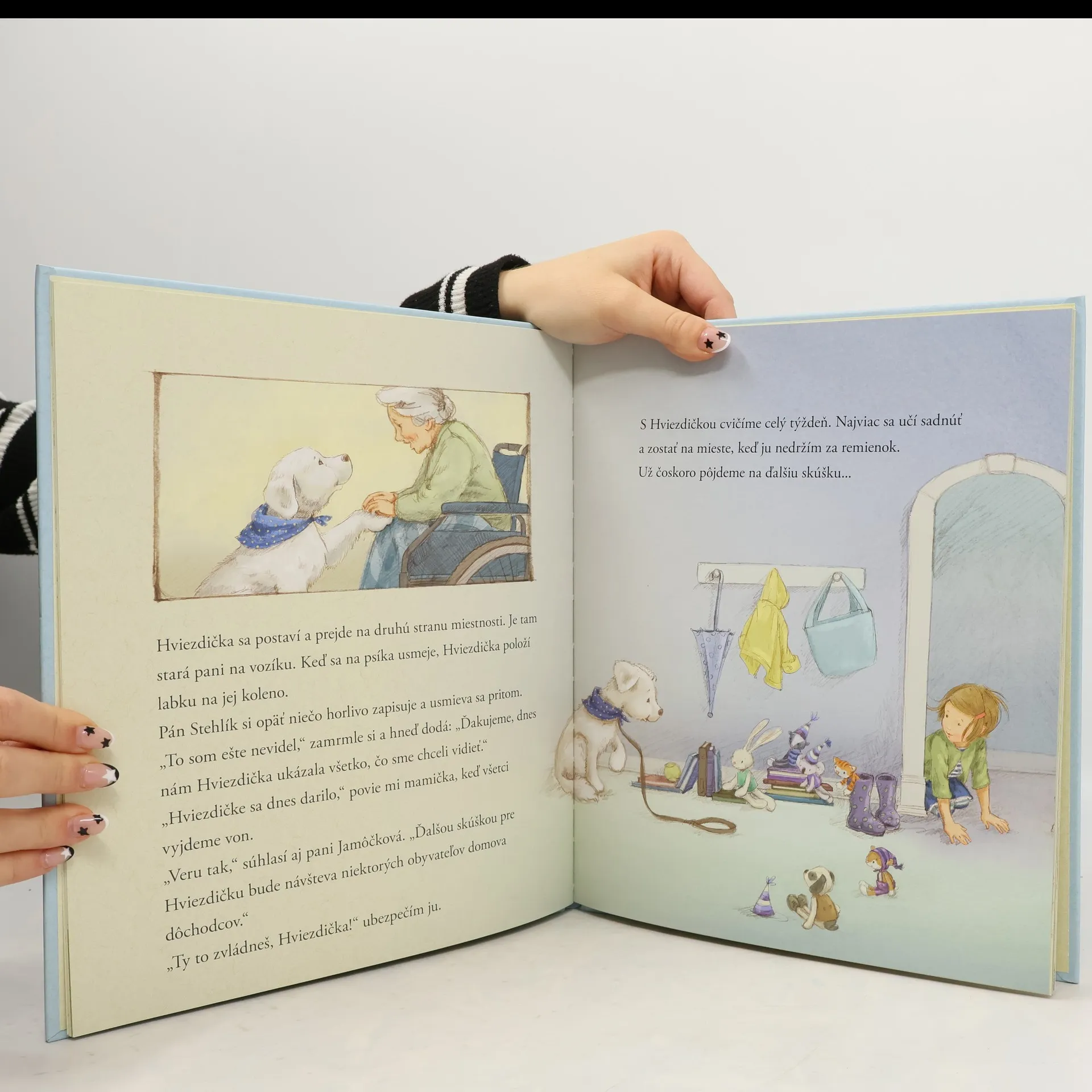 Aj malá láskavosť dokáže zmeniť svet. Z malej Hviezdičky je už veľký psík. S pomocou Magdalénky sa vydá na cestu pomáhania ľuďom, chce sa stať terapeutickým psom. Spolu objavili miesto, kde na ich pomoc a láskavosť vždy s radosťou čakajú, domov pre dôchodcov. Magdaléna a jej Hviezdička sa veľmi snažia potešiť všetkých starčekov a starenky, s ktorými sa zoznámia. Za starkými sa pravidelne vracajú, úsmev na tvári jedného smutného osamelého starčeka však stále neprichádza. Podarí sa Hviezdičke zvládnuť skúšku terapeutického psíka a spolu s Magdalénou potešiť aj jeho? Medzigeneračný príbeh lásky a empatie je dôležitým kúskom zbierky o Magdaléne a jej psíkovi. V edícii vyšli tituly: Magdaléna a psík z knižnice, Magdaléna a zvieratká v útulku .