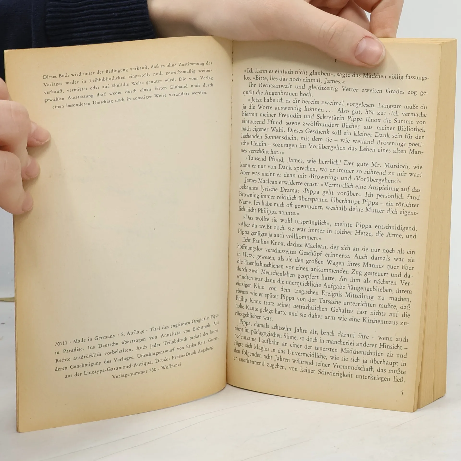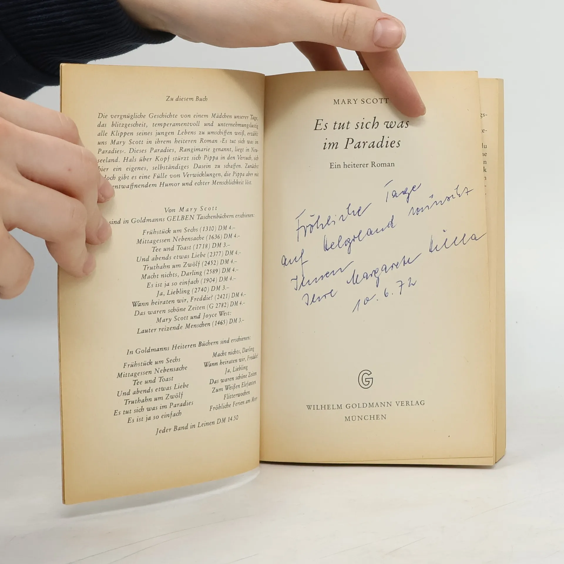 Dieses Paradies, Rangimarie genannt, legt in Neuseeland. Hals über Kopf stürzt sich Pippa in den Versuch, sich hier ein eigenes, selbständiges Dasein zu schaffen......Die vergnügliche Geschichte von einem Mädchen unserer Tage, das blitzgescheit, temperamentvoll und unternehmungslustig alle Klippen seines jungen Lebens zu umschiffen weiß, erzählt uns Mary Scott in ihrem heiteren Roman.