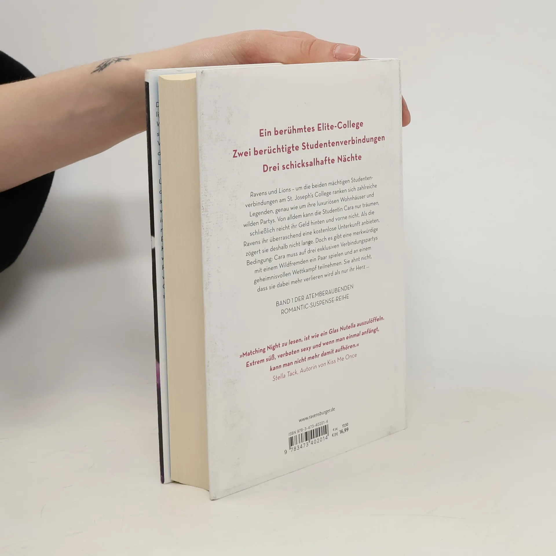 Ein berühmtes Elite-College. Zwei berüchtigte Studentenverbindungen. Drei Nächte, die über dein Schicksal entscheiden. Ravens und Lions – um die beiden mächtigen Verbindungen am St. Joseph‘s College ranken sich zahlreiche Legenden, genau wie um ihre luxuriösen Wohnhäuser und wilden Partys. Von alldem kann die Studentin Cara nur träumen, schließlich reicht ihr Geld hinten und vorne nicht. Als die Ravens ihr überraschend eine kostenlose Unterkunft anbieten, zögert sie deshalb nicht lange. Doch es gibt eine merkwürdige Bedingung: Cara muss auf drei exklusiven Verbindungspartys mit einem Wildfremden ein Paar spielen und an einem geheimnisvollen Wettkampf teilnehmen. Sie ahnt nicht, dass sie dabei mehr verlieren wird als nur ihr Herz … Knisternd. Glamourös. Gefährlich. Band 1 der atemberaubenden Dark-Academia-Reihe von Erfolgsautorin Stefanie Hasse Der „Matching Night“-Zweiteiler: Matching Night, Band 1: Küsst du den Feind? Matching Night, Band 2: Liebst du den Verräter? Weitere Bücher von Stefanie Hasse: Secret Game. Brichst du die Regeln, brech ich dein Herz. Pretty Dead. Wenn zwei sich lieben, stirbt die Dritte. Bad Influence. Reden ist Silber, Posten ist Gold. December Dreams. Ein Adventskalender. ***Leseprobe*** Die Zeit bleibt stehen, während unzählige Augenpaare auf uns gerichtet sind. Wenn ich geglaubt habe, dass es vorher still im Raum war, so herrscht jetzt ein Vakuum außerhalb von ihm und mir und der prickelnden Berührung unserer Lippen. Ich will mich instinktiv von diesem Überfall zurückziehen, meine Handflächen pressen gegen seine Brust und ich spüre das hämmernde Herz unter dem weichen Stoff seines Hemds. Es schlägt im selben rasenden Takt wie meins, nervös, verängstigt und … berauscht. Ehe ich mich versehe, erwidere ich den Kuss, schiebe ihn nicht länger von mir weg, sondern kralle mich an seinem Hemd fest und ziehe ihn näher. Der Kuss vertieft sich, ich nehme den rauchigen Geschmack seines Whiskeys wahr, als seine Zunge endlich auf meine trifft. Niemand unterbricht uns.