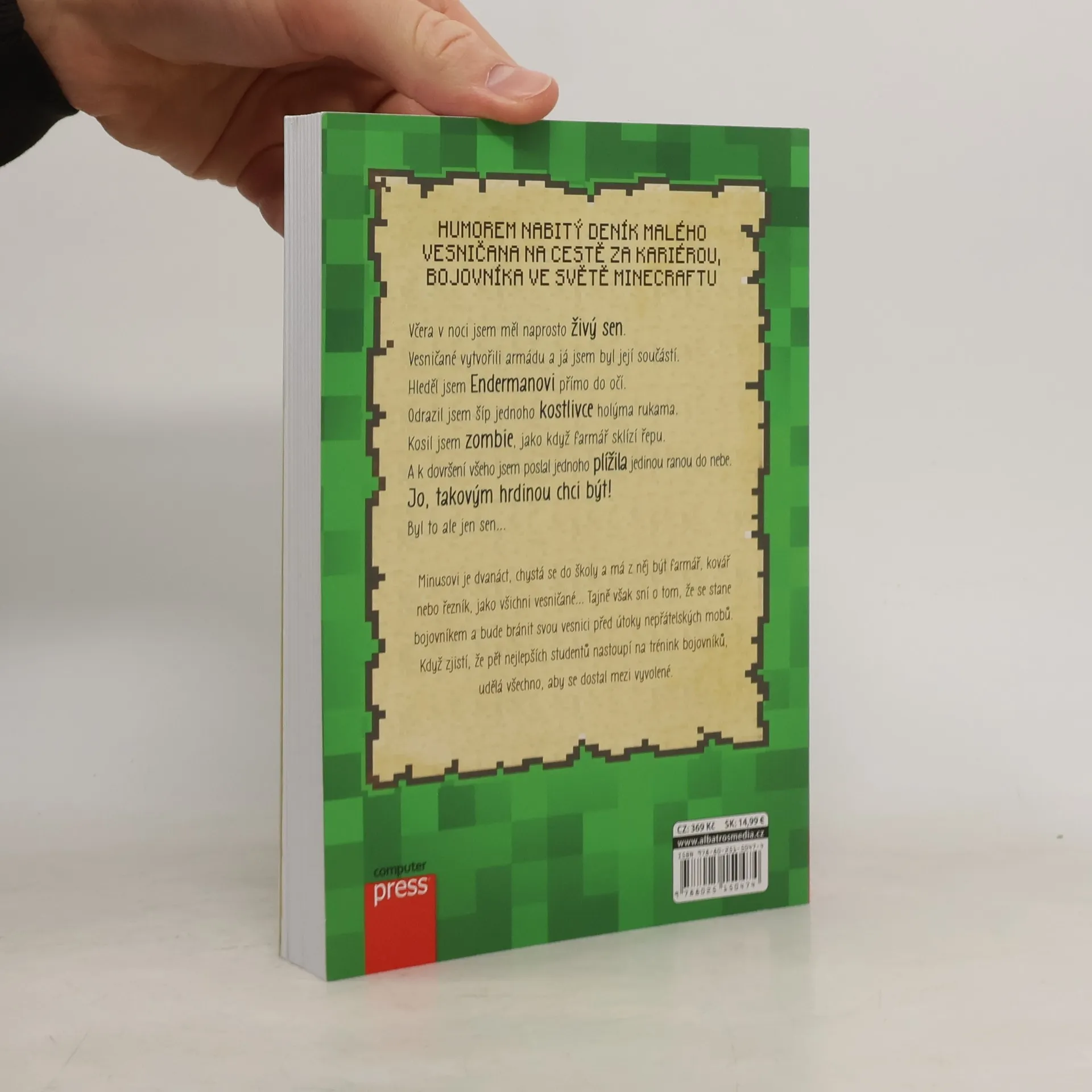 Deník jednoho obyčejného kluka v neobyčejném světě Minecraftu. Jmenuji se Minus. Je mi dvanáct a píšu si deník. Jo a žiju v Minecraftu. Stejně jako všichni ostatní od nás, se mám stát farmářem. Já chci ale něco jiného! Vždycky jsem tajně snil o tom, že se stanu bojovníkem a budu bránit svou vesnici před útoky nepřátelských mobů. A nyní mám příležitost si svůj sen splnit… Zjistil jsem totiž, že pět nejlepších studentů z naší školy nastoupí na trénink bojovníků. Udělám vše pro to, abych se dostal mezi ně!