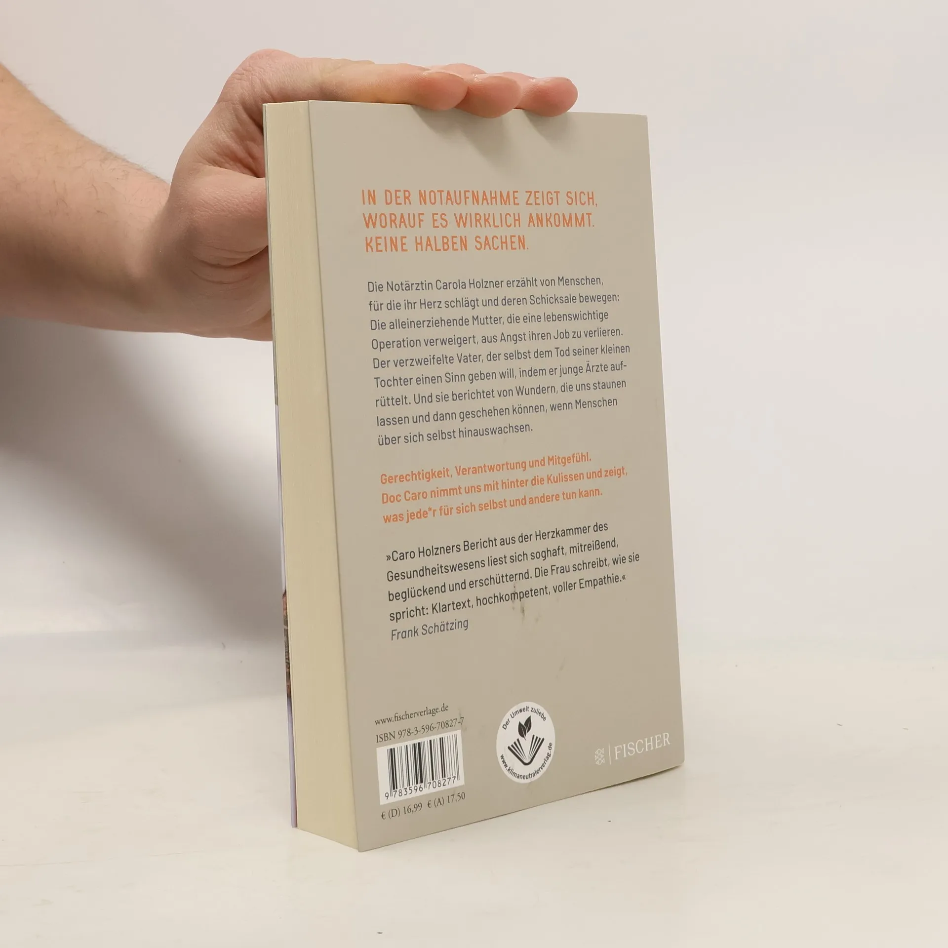 In der Notaufnahme zeigt sich, worauf es wirklich ankommt! Sie verändert den Blick aufs Leben. Keine halben Sachen. Die Notärztin Carola Holzner spricht Klartext. Dabei bleibt sie immer sie selbst mit Blick auf die, für die ihr Herz schlägt: ihre Patientinnen und Patienten und deren Schicksale. Sie berichtet von Menschen, die alle auf ihre Art bewegen: Die alleinerziehende Mutter, die eine lebenswichtige Operation verweigert, aus Angst ihren Job zu verlieren. Der verzweifelte Vater, der selbst dem Tod seiner kleinen Tochter einen Sinn geben will, indem er junge Ärzte aufrüttelt. Und sie berichtet von Wundern, die uns staunen lassen und dann geschehen können, wenn Menschen über sich selbst hinauswachsen. Denn das Leben schreibt immer noch die besten Geschichten. Gerechtigkeit, Verantwortung und Mitgefühl. In der Notaufnahme stellen sich die wichtigen Fragen des Lebens. Doc Caro nimmt uns mit hinter die Kulissen und zeigt, dass jede/r Einzelne für sich selbst und andere etwas tun kann. Wer noch mehr von Doc Caro lesen möchte: »Eine für alle. Als Notärztin zwischen Hoffnung und Wirklichkeit«