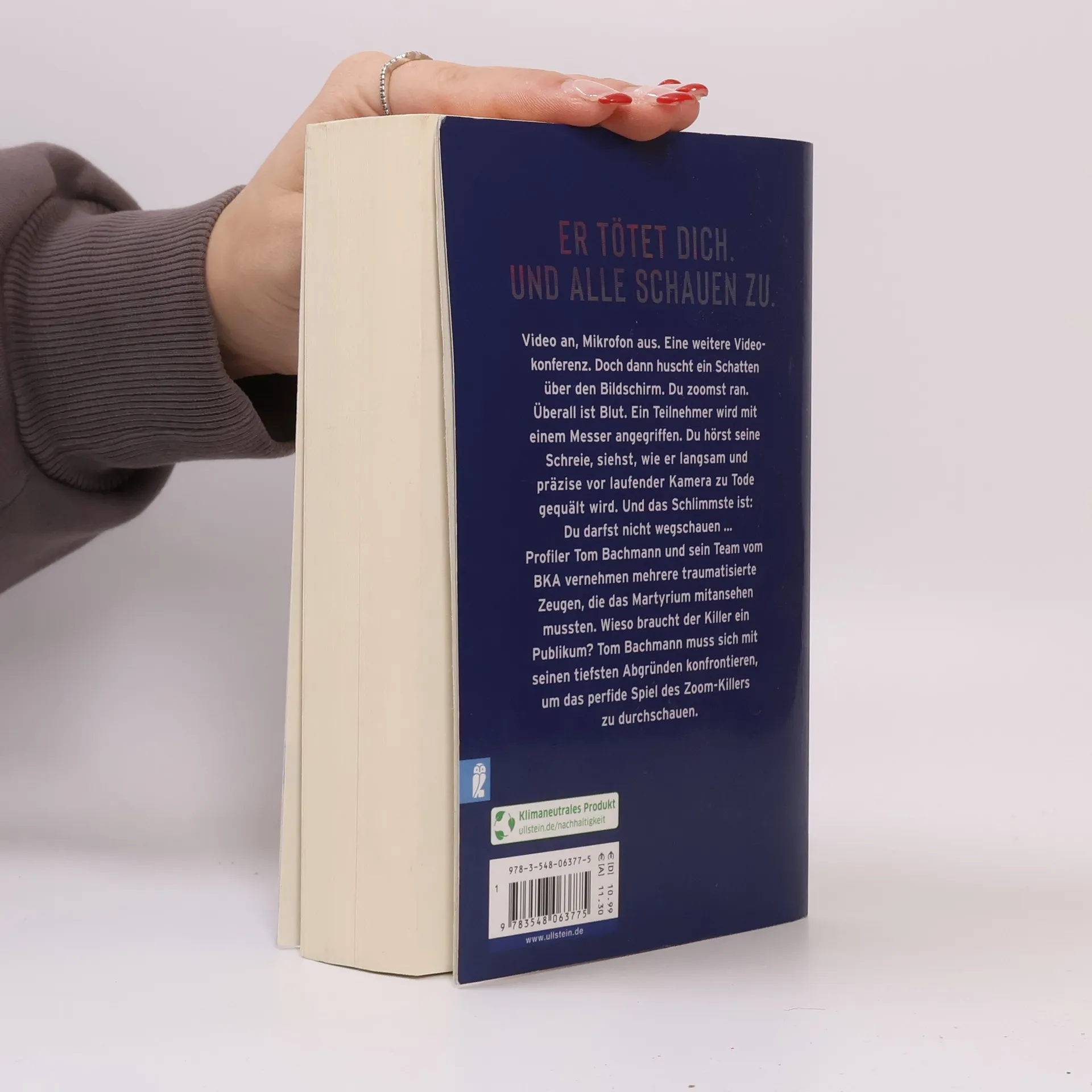 Er tötet dich. Und alle schauen zu. Video an, Mikrofon aus. Eine weitere Videokonferenz. Doch dann huscht ein Schatten über den Bildschirm. Du zoomst ran – und plötzlich ist überall Blut. Ein Teilnehmer wird mit einem Messer angegriffen. Du hörst seine Schreie, siehst wie er langsam und präzise vor laufender Kamera gequält wird. Und das Schlimmste ist: Du darfst nicht wegschauen... „Seelenleser“ Tom Bachmann und sein Team vom BKA vernehmen mehrere traumatisierte Zeugen, die mitansehen mussten, wie ihr Kollege zu Tode gefoltert wurde. Doch wieso braucht der Killer ein Publikum? Bachmann, der als Profiler mit den schlimmsten Psychopathen zu tun hatte, muss sich mit seinen eigenen Abgründen konfrontieren, um das perfide Spiel des Zoom-Killers zu durchschauen. Für alle, die den Nervenkitzel suchen