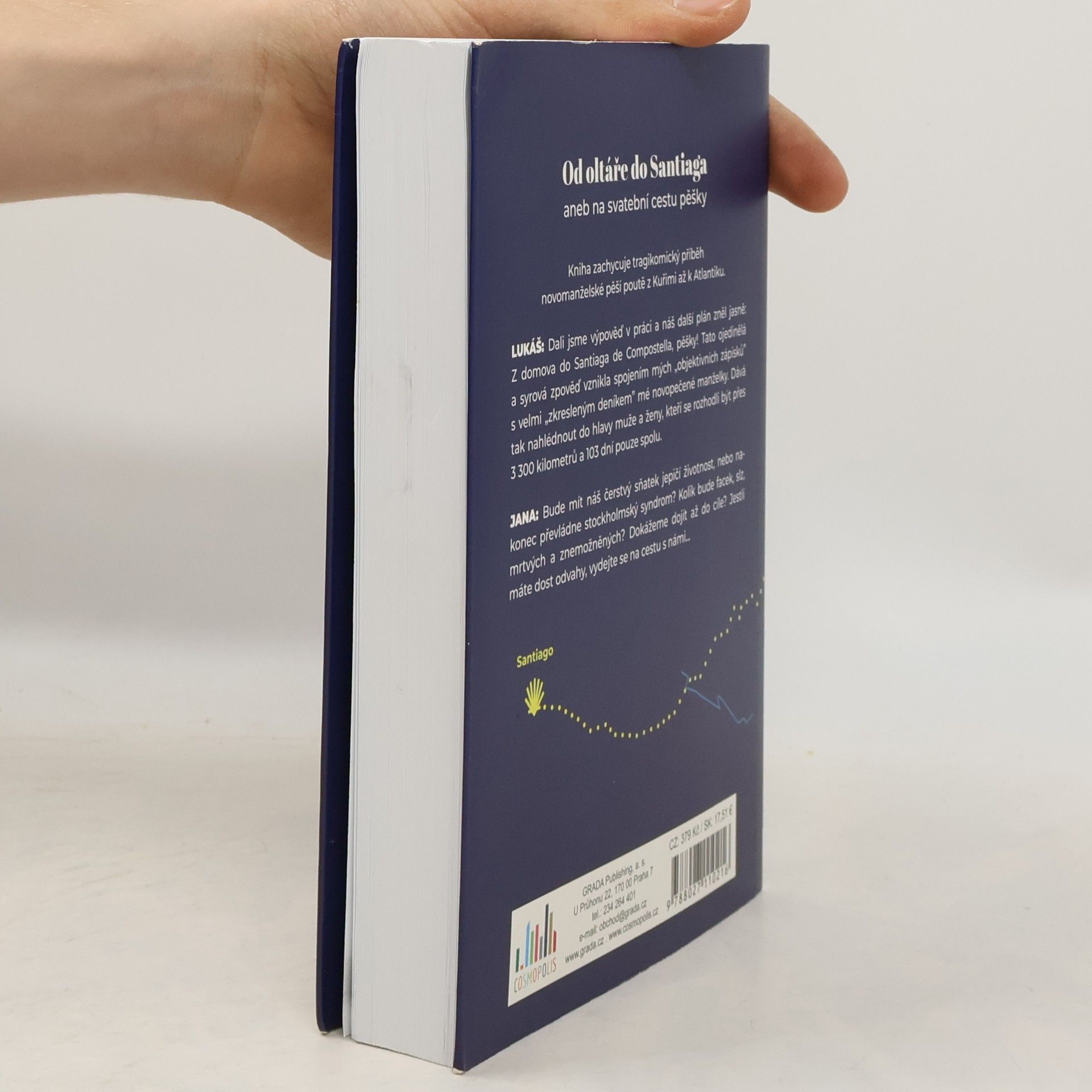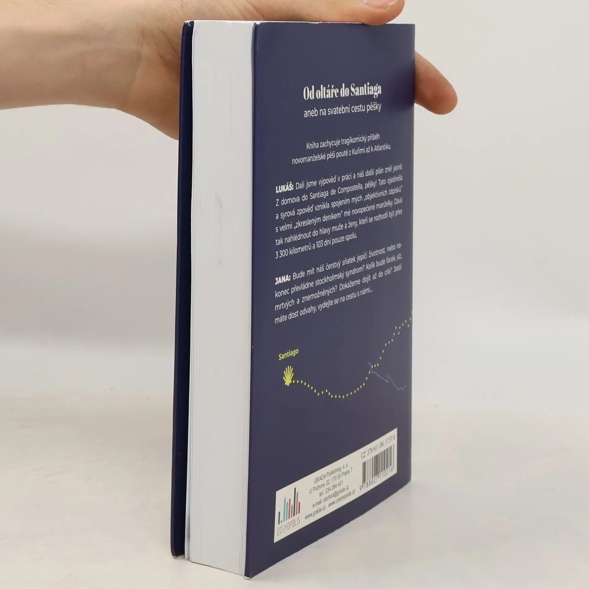 Novomanželská pouť do Santiaga zachycuje tragikomický příběh naší pěší poutě formou deníkových zápisků. Náš plán zněl jasně: „Z domova, k Atlantiku, pěšky!“. Kniha je oboupohlavní. Vznikla spojením mých mužských objektivních zápisků s, dle mého názoru, velmi zkresleným deníkem mé novopečené manželky. Dává tak nahlédnout do hlavy muže a ženy, kteří se rozhodli být přes 3 500 kilometrů spolu. (Kvůli této naší svatební cestě jsem dokonce dal výpověď z práce.) Bude mít náš sňatek jepičí životnost, nebo nakonec převládne Stockholmský syndrom? Kolik bude facek, slz, mrtvých a znemožněných? Dokážeme dojít do cíle? Uvolněte se a pojďte s námi.