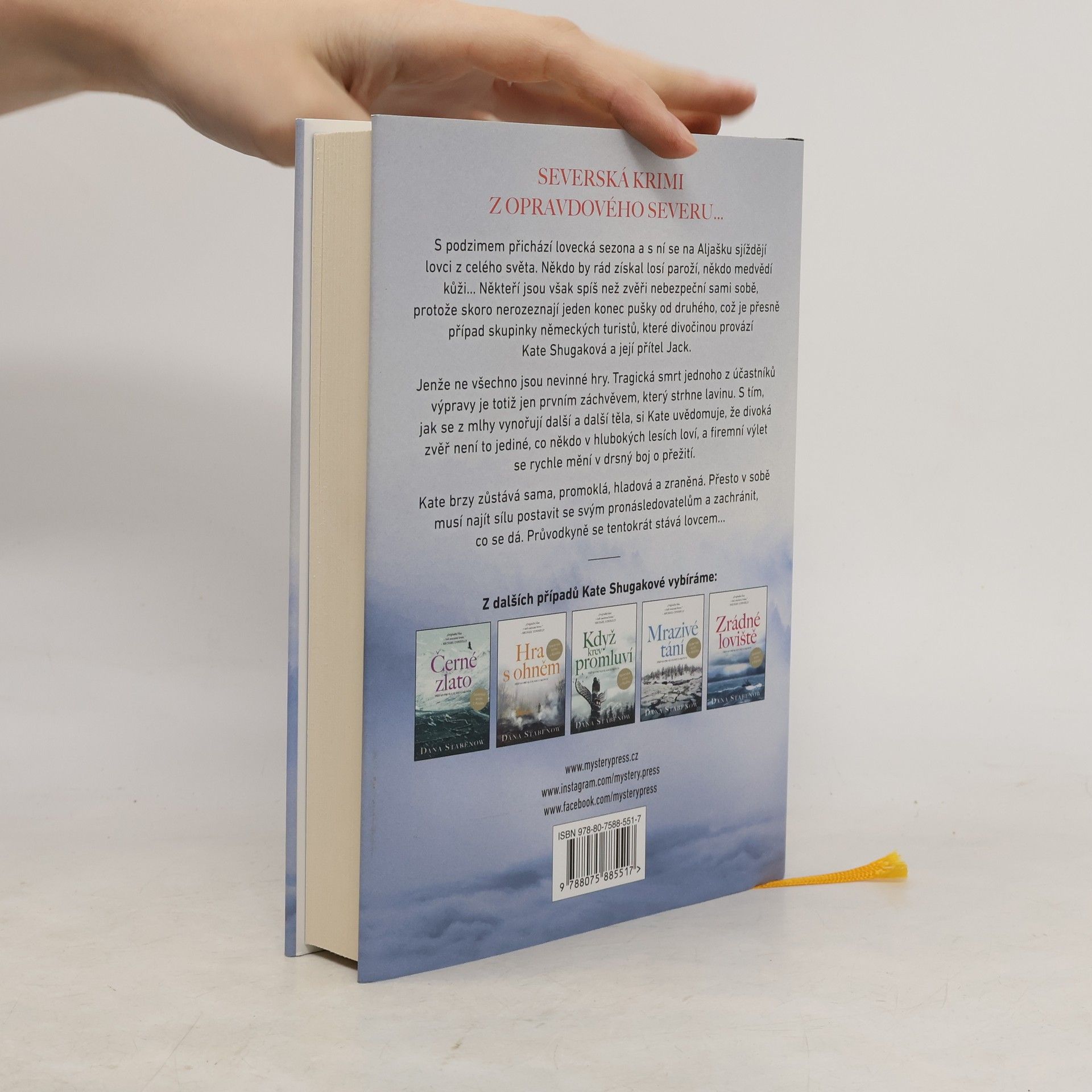 SEVERSKÁ KRIMI Z OPRAVDOVÉHO SEVERU… S podzimem přichází lovecká sezona a s ní se na Aljašku sjíždějí lovci z celého světa. Někdo by rád získal losí paroží, někdo medvědí kůži… Někteří jsou však spíš než zvěři nebezpeční sami sobě, protože skoro nerozeznají jeden konec pušky od druhého, což je přesně případ skupinky německých turistů, které divočinou provází Kate Shugaková a její přítel Jack. Jenže ne všechno jsou nevinné hry. Tragická smrt jednoho z účastníků výpravy je totiž jen prvním záchvěvem, který strhne lavinu. S tím, jak se z mlhy vynořují další a další těla, si Kate uvědomuje, že divoká zvěř není to jediné, co někdo v hlubokých lesích loví, a firemní výlet se rychle mění v drsný boj o přežití. Kate brzy zůstává sama, promoklá, hladová a zraněná. Přesto v sobě musí najít sílu postavit se svým pronásledovatelům a zachránit, co se dá. Průvodkyně se tentokrát stává lovcem…