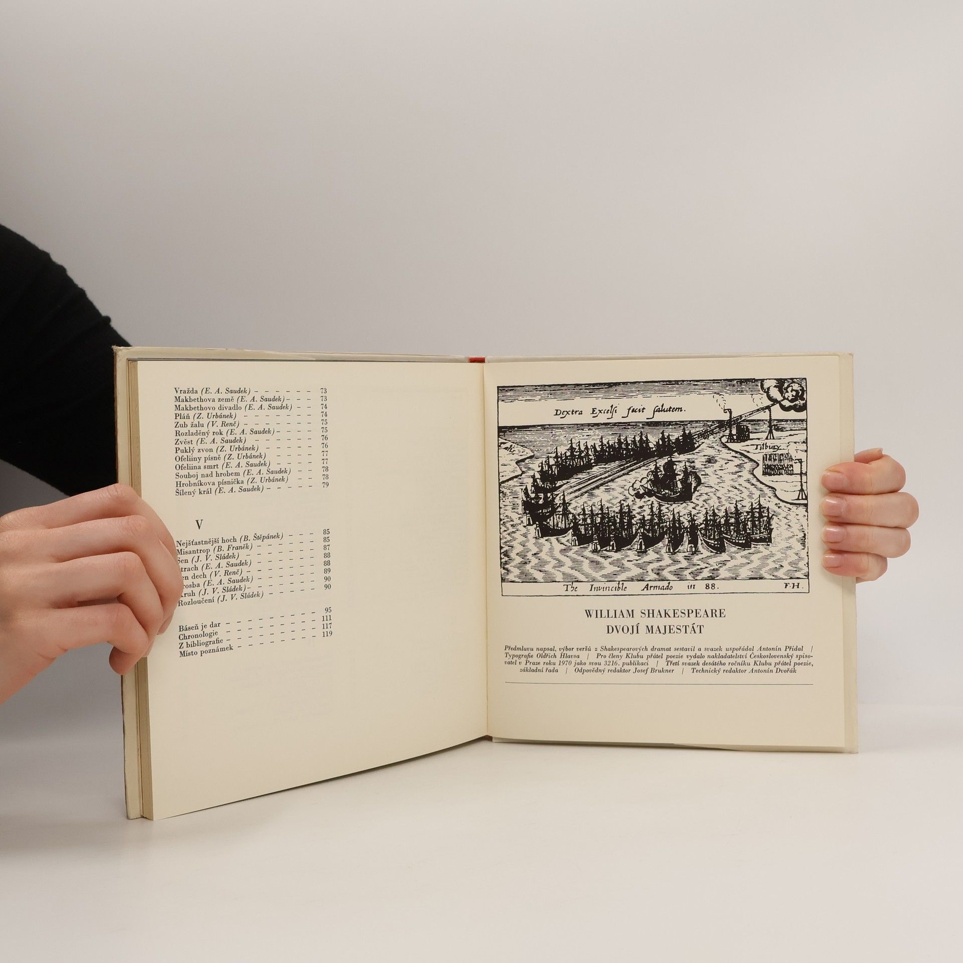 Výbor veršů z dramat W. Shakespeara, úryvky z monologů i dialogů. Předmluvu napsal, výbor z veršů sestavil a svazek uspořádal Antonín Přidal. Část nákladu vydána s mikrodeskou.