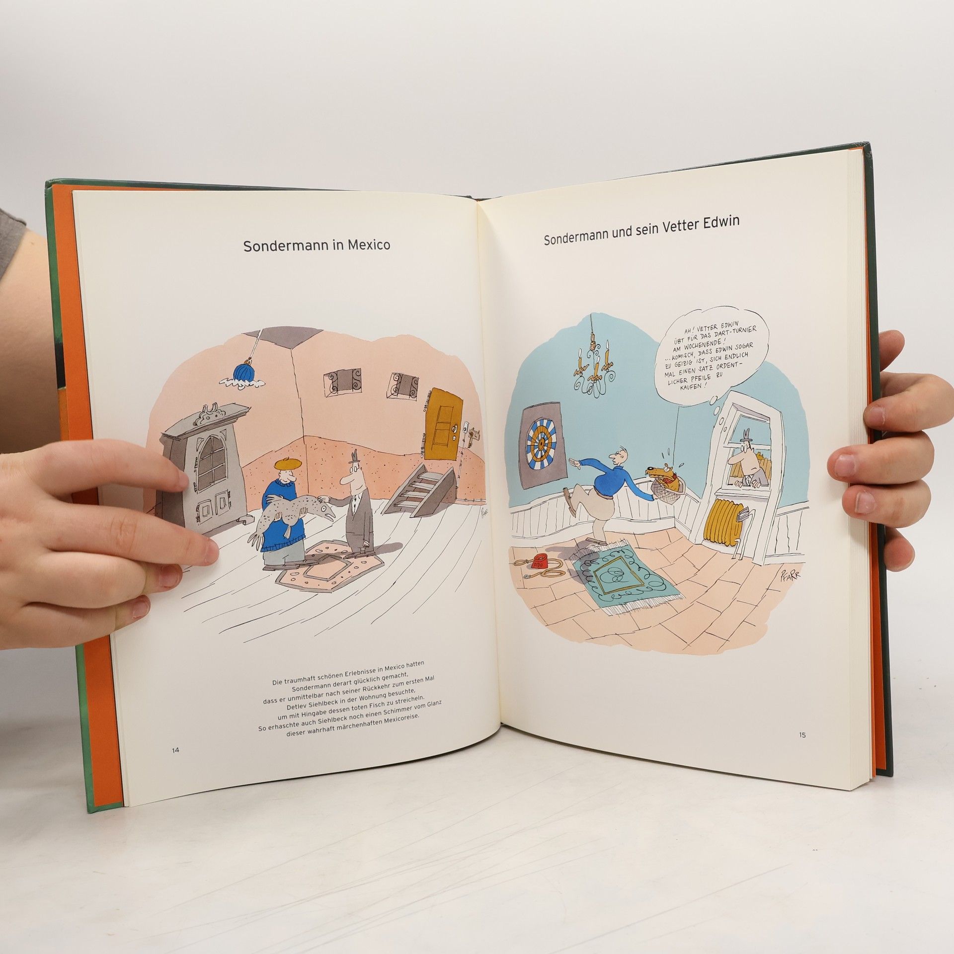 „Es gibt kaum etwas Schöneres als den feinen, intelligenten und schwerelosen Humor von Bernd Pfarr.“ Der Bund. „Natürlich müssten alle Glocken läuten, auf allen Straßen müsste getanzt und in allen Parks müssten Feuerwerkskörper entzündet werden, wenn eine große Comicfigur auf die Welt kommt, und dieser Mann ist eine große Comicfigur„, begrüßte Robert Gernhardt enthusiasmiert die ersten Auftritte des kauzigsten aller Buchhalter, der inzwischen zu einem der meistgeliebten deutschen Cartoonklassiker geworden ist. In Sondermanns grotesken Abenteuern erweist sich Pfarrs Meisterschaft, eine Szene so zu verdichten, dass selbst die sparsam gezeichneten Bilder eine ganze Welt aufscheinen lassen. Sogar die Vorgeschichte schwingt noch mit, und immer lässt Pfarr der Szene noch ein kleines Geheimnis: “Das finde ich besonders spannend: Einen Witz nicht bis zum bitteren Ende zu erzählen, sondern alles noch ein bisschen schwebend zu lassen und damit auch die Fantasie des Betrachters mit einzubeziehen„ (B. P.). Dies sind Sondermanns neueste erstaunliche Erlebnisse, sie erscheinen hier erstmals in Buchform. Und es ist die größte Sondermann-Sammlung bisher. Immer sind es Episoden weit abseits der profanen Wirklichkeit, zuweilen geschmacklos und immer wieder auch gern politisch unkorrekt (Negerschrubben!): Sondermann trifft ein Nashorn, das Sondermanns Werbebotschaft “Esst mehr Nashornpaste„ wenig abgewinnen kann und handgreiflich wird. Zarte Bande knüpft er nur einmal, als er Fräulein Charlotte als frivol gewandeter Bote vom “Cupido Liebesbrief Kurierservice„ gegenübertritt. Eine Verabredung mit Frau Dr. Rübsam zum Tanztee endete irgendwie unbefriedigend … In den weiteren Nebenrollen erscheinen u. a. sprechendes Toilettenpapier, Plüschbügeleisen, ägyptische Klebstreifenabroller, Kampfmumien, tanzende Schuhschränkchen, bedrohlich auftretende Designerlampen, lebensgefährliche Sofas, Buchhalterschleudern, ein Walfischtranzerstäuber, eine Giraffenhirnextraktpistole, der Maulwurf Leopold, Super-Erpel und natürlich Gott. “Ein Blick, ein Satz, und schon ist man verliebt in Pfarrs kauzige Figuren„ (Brigitte). “Sondermann - das ist ein Feuerwerk trockener und manchmal fast geschmackloser Gags … Ob Kannibalismus, Krawattenkauf oder Schläge mit dem finnischen Stahllineal, Sondermann garantiert humoristische Comic-Burlesken der besonderen Art.„ Stadtillustrierte AZ, Frankfurt. Über den Autor & Zeichner: Bernd Pfarr (Jahrgang 1958) ist einer der erfolgreichsten und produktivsten deutschen Cartoonisten und Buchillustratoren. Seit 1978 zeichnet er für verschiedene Zeitschriften und Verlage. Sein Sondermann ist Stammgast in der “Titanic„, daneben veröffentlicht Pfarr u. a. in der “Zeit„ und im “Tages-Anzeiger„. Er hat zahlreiche Bücher illustriert, Buchtitel entworfen und 1999 zusammen mit Elke Heidenreich das Kinderbuch “Sonst noch was?„ veröffentlicht. 1998 erhielt er den “Max-und-Moritz-Preis", der an die besten deutschsprachigen Comic-Künstler vergeben wird.