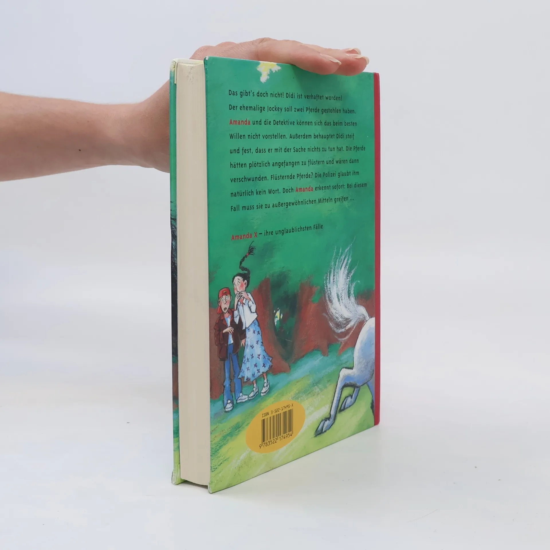 Günter hat in diesem Jahr einen ausgefallenen Geburtstagswunsch: Er bittet Amanda X Kontakt zu einem Verstorbenen aufzunehmen - und zwar zu seinem über alles geliebten Pferd Luise! Als Amanda in ihre Kristallkugel blickt, erfüllt plötzlich ein Flüstern den Raum. Ein Pferdeflüstern. Kurz darauf toben auf der Pferderennbahn zwei Pferde in ihren Boxen. Als am nächsten Tag die beiden Pferde spurlos verschwunden sind, erkennen Amanda und die Detektive sofort: Bei diesem Fall müssen sie zu außergewöhnlichen Mitteln greifen. Amanda X einmal mehr in Hochform. Ab 10 Jahren