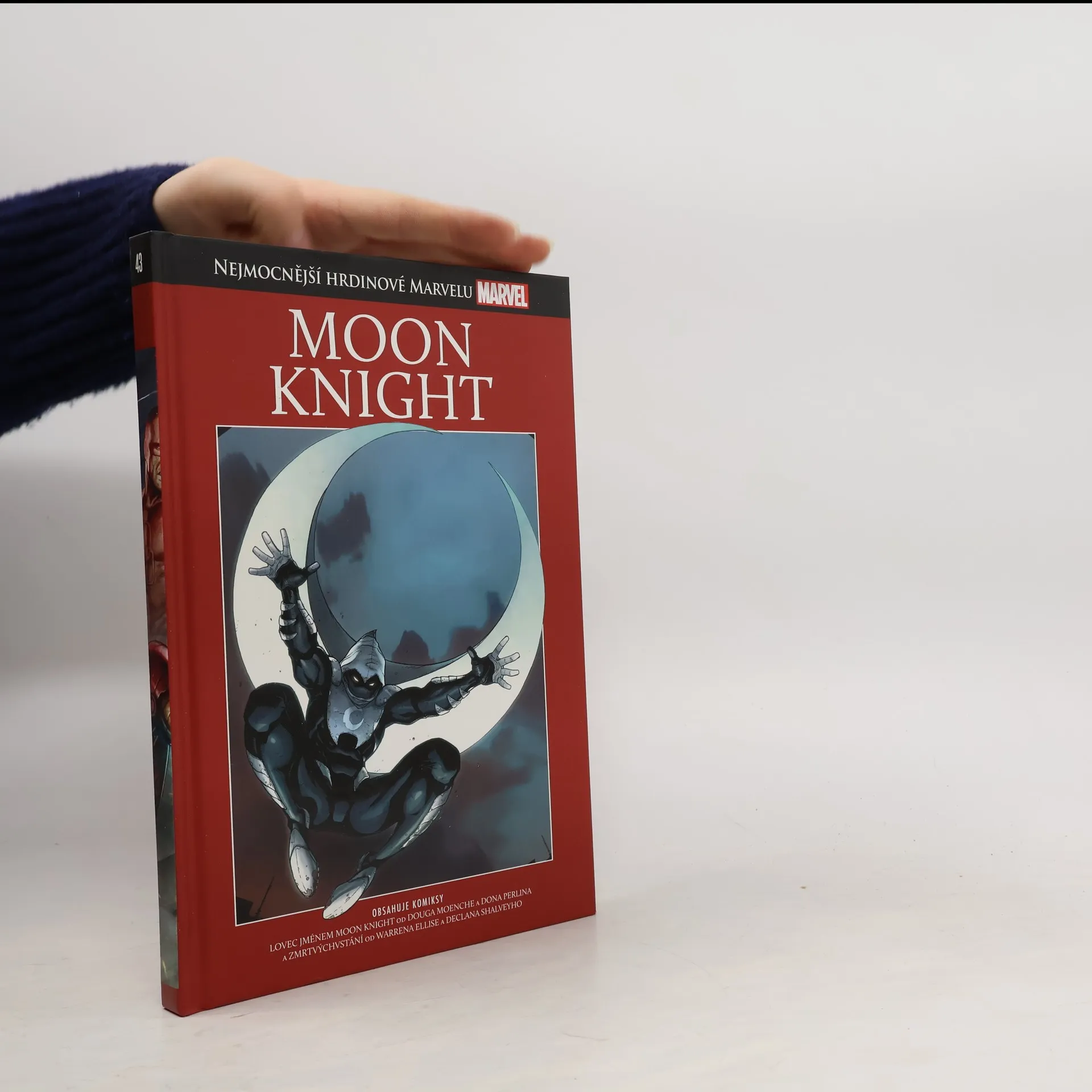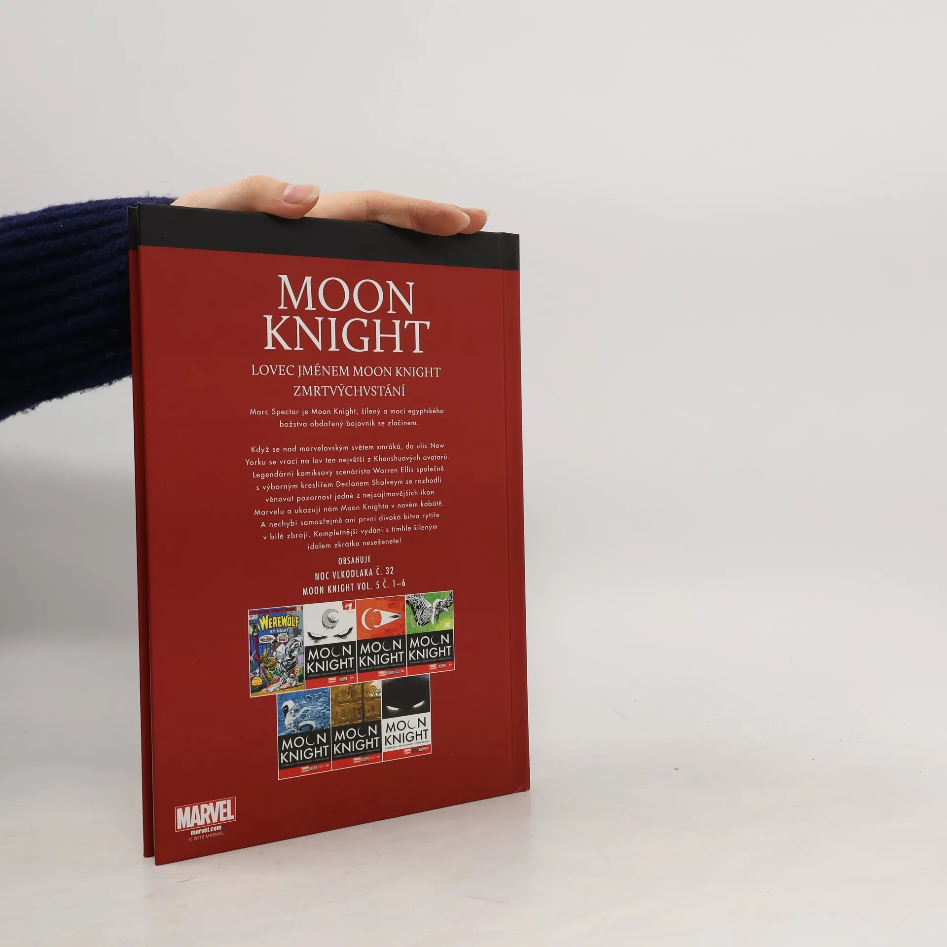 Marc Spector je Moon Knight, šílený a mocí egyptského božstva obdařený bojovník se zločinem. Legendární komiksový scénárista Warren Ellis společně s výborným kreslířem Declanem Shalveym se rozhodli věnovat pozornost jedné z nejzajímavějších ikon Marvelu a ukazují nám Moon Knighta v novém kabátě. A nechybí samozřejmě ani první divoká bitva rytíře v bílé zbroji. Kompletnější vydání s tímhle šíleným idolem zkrátka neseženete! Obsahuje: Lovec jménem Moon Knight Zmrtvýchvstání