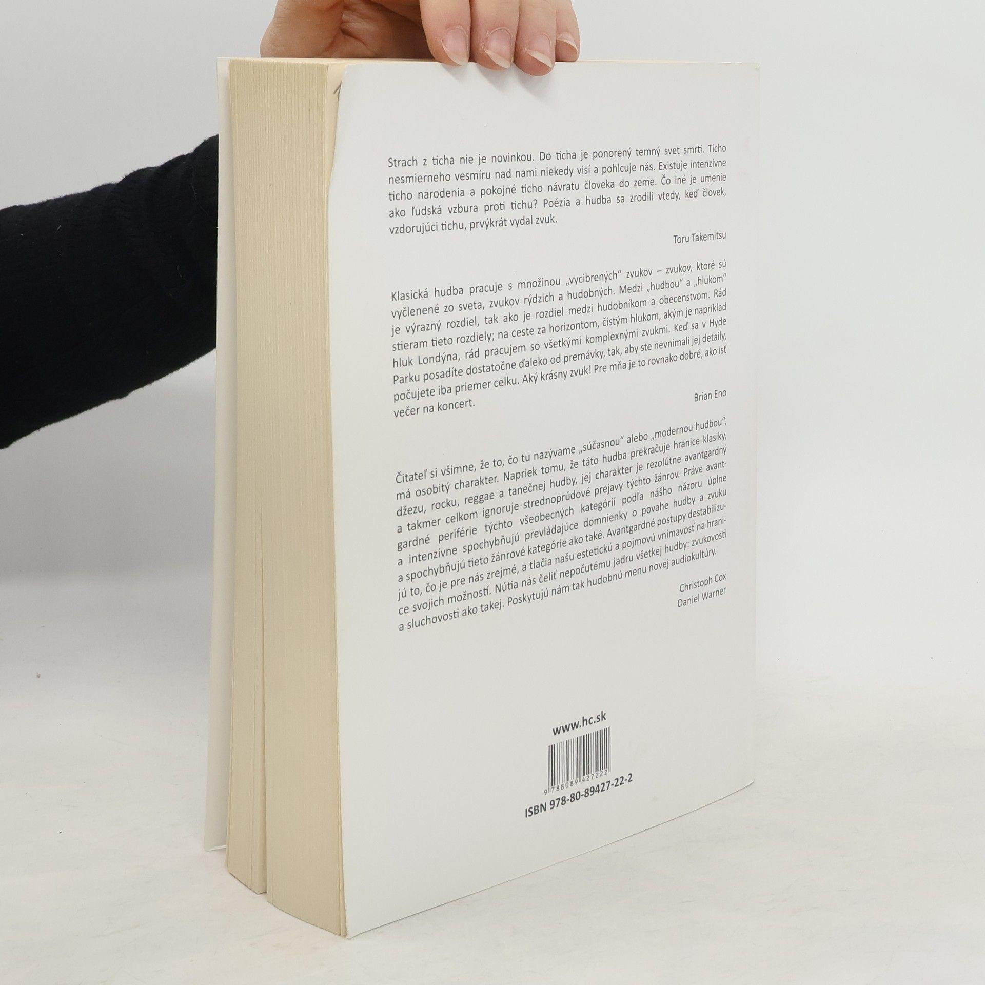 Hudba na počiatku tretieho milénia už dávno nie je iba hierarchickým vzťahom medzi skladateľom, interpretom a poslucháčom. Tradíciou ustálené roly všetkých troch subjektov tohto trojuholníka 20. storočie dokonale spochybnilo. Dá sa však zrozumiteľne hovoriť o tom, čo sa za posledných sto rokov v hudbe udialo? Editori zborníka Audiokultúra Christoph Cox a Daniel Warner zhromaždili päťdesiatšesť textov od skladateľov, interpretov, muzikológov, kritikov a estetikov, ktorí sa o súčasnej hudbe vyjadrujú zasvätene, provokatívne a presvedčivo. Tematickú šírku zborníka ilustruje jednoduchý výpočet autorov: Adorno, Aphex Twin, Attali, Bailey, Braxton, Brown, Burroughs, Cage, Cardew, Cascone, Coleman, Conrad, Cowell, Cox, Cutler, Eco, Eisler, Eno, Eshun, Feldman, Gann, Gould, Chambers, Lewis, López, Marclay, McClary, McLuhan, Mertens, Miller, Moholy-Nagy, Murray Schafer, Neill, Nyman, Oliveros, Oswald, Randall, Reich, Reynolds, Russo, Russolo, Rzewski, Sherburne, Schaeffer, Slouka, Stockfelt, Stockhausen, Tone, Toop, Varèse, Warner, Zorn.