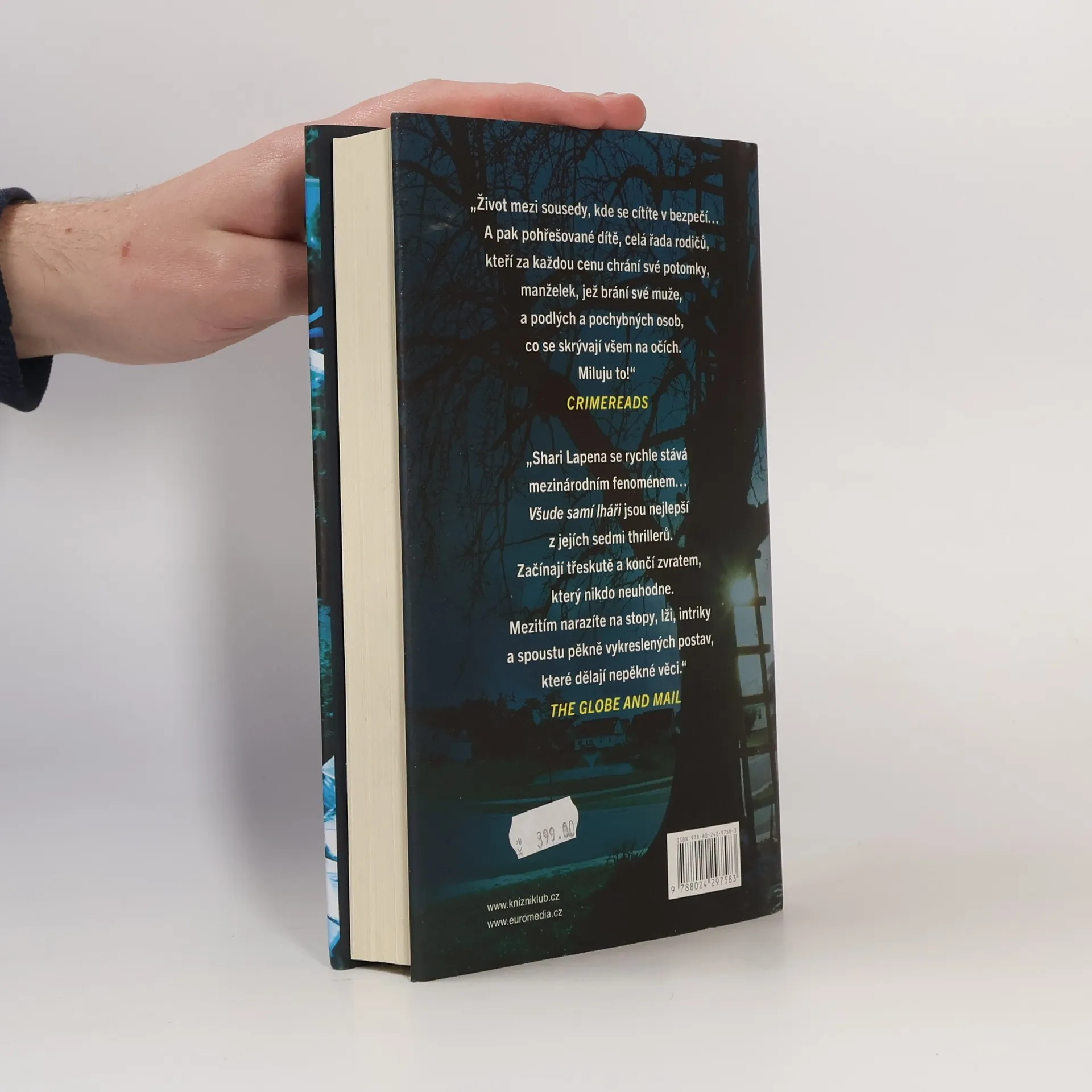 Psychologický thriller, ve kterém pátrání po devítileté dívce odkrývá skutečné vztahy a dobře ukrývaná tajemství na malém městě. Z městečka Stanhope doslova sálá klid a bezpečí. Než se ztratí Avery, dcera místního bezúhonného lékaře. Ten se stane podezřelým číslo jedna, ale ne jediným. Někdo Avery viděl nastupovat do auta jednoho mladíka. A své nejlepší kamarádce tvrdila, že má staršího přítele. Najednou tady každý na někoho něco ví. Ale dá se tu vůbec někomu věřit? Nakladatelská anotace. Kráceno.