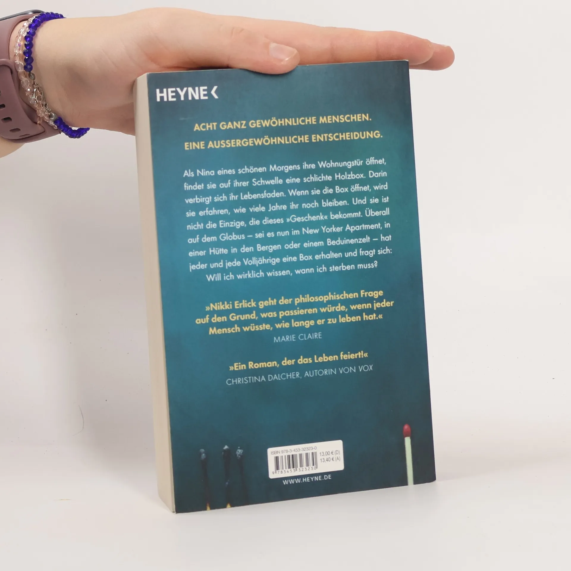 Als Nina eines schönen Morgens ihre Wohnungstür öffnet, findet sie auf ihrer Schwelle eine schlichte Holzbox. Darin verbirgt sich ihr Lebensfaden. Wenn sie die Box öffnet, wird sie erfahren, wie viele Jahre ihr noch bleiben. Und sie ist nicht die Einzige, die dieses »Geschenk« bekommt. Überall auf dem Globus – sei es nun im New Yorker Apartment, in einer Hütte in den Bergen oder einem Beduinenzelt – hat jeder Volljährige eine Box erhalten und fragt sich: Will ich wirklich wissen, wann ich sterben muss? Einfühlsam und klug erzählt Nikki Erlick, was mit der Gesellschaft, mit Beziehungen und mit jedem einzelnen Individuum passiert, wenn uns die eigene Sterblichkeit drastisch vor Augen geführt wird. »Die Vorhersage« ist ein berührender Roman über das Leben und das Sterben, über Freundschaft und Liebe und über das Menschsein selbst.