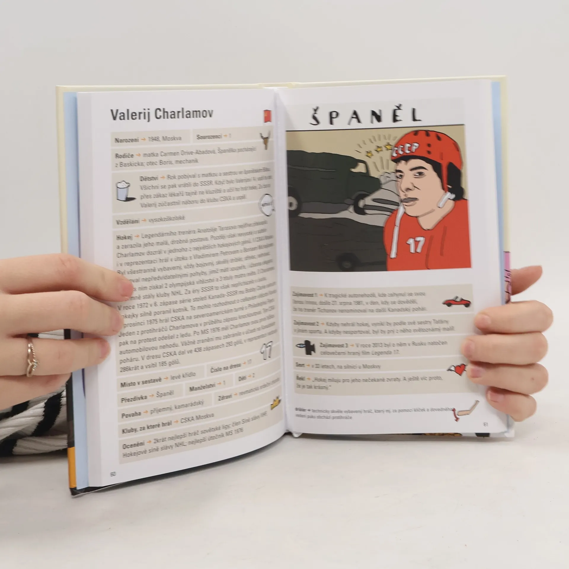 Nejslavnější hokejisté všech dob v nejpřehlednějším vydání. Víte, který hokejista dokázal na bruslích vyvinout rychlost přes 40 km za hodinu; kdo byl náhodným vynálezcem zahnuté čepele hokejové hole; čemu se v hokejové hantýrce říká semafor nebo motýlí styl a jak se Wayne Gretzky stalnejlepším hokejistou všech dob, i když se v NHL zprvu domnívali, že kvůli drobnější postavě není dostatečně fyzicky vybavený? Dozvíte se, jak byl slavný československý hokejista obviněn z protistátního spiknutí a dostal trest patnáct let; jak jeden z nejslavnějších brankářů měl svou první hokejku vyrobenou z kořene stromu, rád nosil vlastnoručně upletená oblečení a jak jiný skvělý brankář vstřelil jako jediný na světě tři góly. Zjistíte, který český hokejista rád ve volném čase maluje a své obrazy vystavuje v galeriích a kdo byl tak všestranným sportovcem, že reprezentoval svou zemi nejen v ledním hokeji, ale také ve fotbalu a v golfu, stal se mistrem ve vodním lyžování a byl i vyhlášeným designerem golfových hřišť. Neunikne vám ani, co je Pasta88 a komu se přezdívá Kapr, Vévoda nebo Ježek. Přečtěte si vše zajímavé a důležité o největších hvězdách světového hokeje dvacátého a jednadvacátého století.