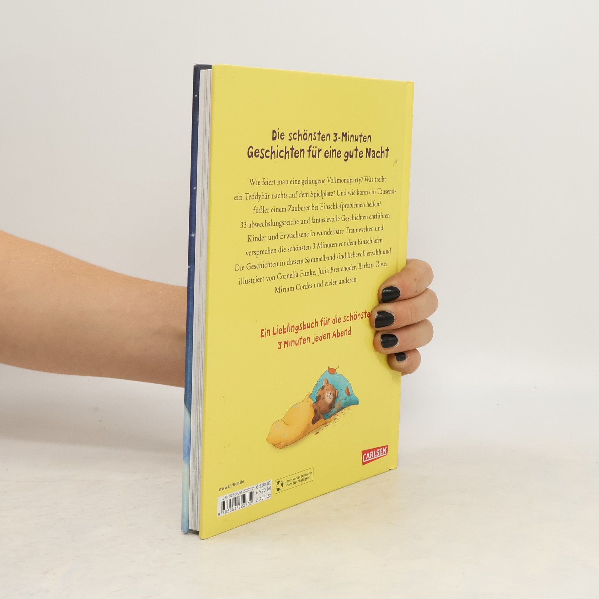 Zauberhafte Gute-Nacht-Geschichten zum Kuscheln und Träumen Wie feiert man eine gelungene Vollmondparty? Was treibt ein Teddybär nachts auf dem Spielplatz? Und wie kann ein Tausendfüßler einem Zauberer bei Einschlafproblemen helfen? 33 abwechslungsreiche und fantasievolle Geschichten entführen Kinder und Erwachsene in wunderbare Traumwelten und versprechen die schönsten 3 Minuten vor dem Einschlafen. Die Geschichten in diesem Sammelband sind liebevoll erzählt und illustriert von Cornelia Funke, Julia Breitenöder, Barbara Rose, Miriam Cordes und vielen anderen. Ein Lieblingsbuch für die schönsten 3 Minuten jeden Abend.