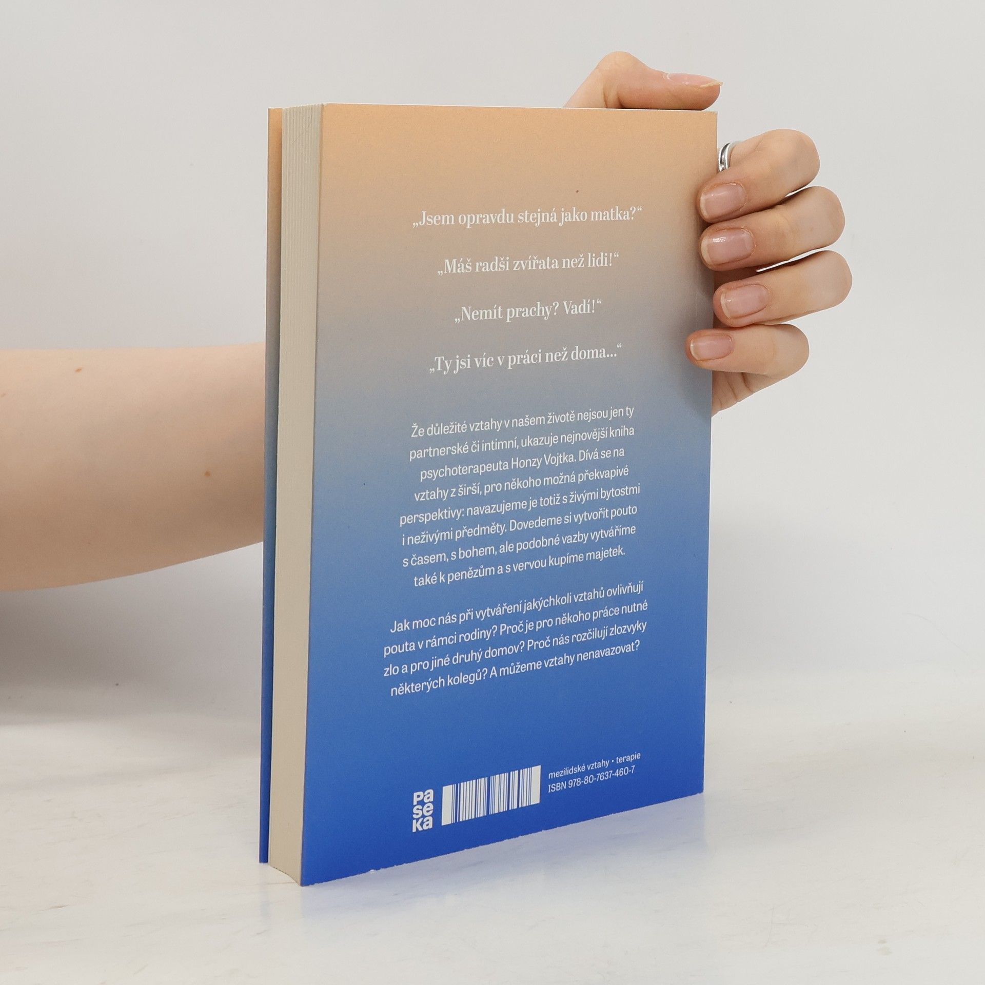 „Jsem opravdu stejná jako matka? „Máš radši zvířata než lidi! „Nemít prachy? Vadí! „Ty jsi víc v práci než doma Že důležité vztahy v našem životě nejsou jen ty partnerské či intimní, ukazuje nejnovější kniha psychoterapeuta Honzy Vojtka. Dívá se na vztahy z širší, pro někoho možná překvapivé perspektivy: navazujeme je totiž s živými bytostmi i neživými předměty. Dovedeme si vytvořit pouto s časem, s bohem, ale podobné vazby vytváříme také k penězům a s vervou kupíme majetek. Jak moc nás při vytváření jakýchkoliv vztahů ovlivňují pouta v rámci rodiny? Proč je pro někoho práce nutné zlo a pro jiné druhý domov? Proč nás rozčilují zlozvyky některých kolegů? A můžeme vztahy nenavazovat?