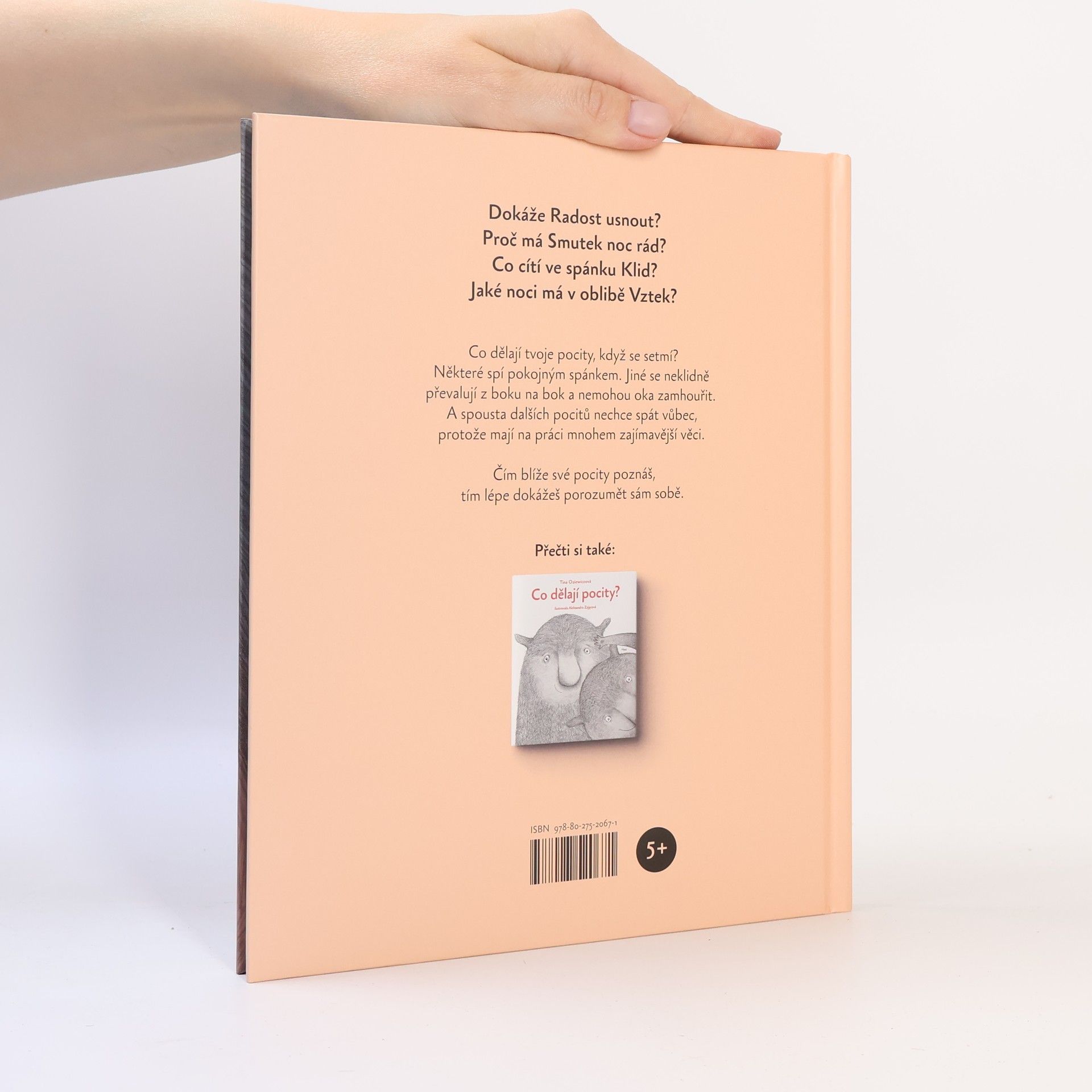 Svět pocitů prozkoumává stále více lidí. Ví ale někdo, co se v něm odehrává… po setmění? Co je tohle za bytůstky? Malé, legrační, baculaté a tak huňaté, že byste je nejradši objali. (No dobrá… možná ne všechny.) Určitě je znáte. Jsou to pocity. Co dělají pocity v noci? Spí? Některé ano. Například spánek Štěstí je hluboký a pokojný. Spí pocity v posteli? Ne vždycky. Třeba Bezstarostnost právě usnula v houpací síti. A zítra se umyje. Nebo taky ne. Pak jsou tu také ty, které se neklidně převalují z boku na bok, protože nemůžou usnout. A spousta dalších, které vůbec spát nechtějí, protože mají na práci mnohem zajímavější věci! V každodenním shonu na své emoce často zapomínáme. Tina Oziewiczová a Aleksandra Zającová nám je poeticky, citlivě a něžně připomínají. Nahlédněte do světa pocitů a poznejte je trochu blíž, z nezvyklého pohledu. Díky tomu potom lépe porozumíte i sami sobě.