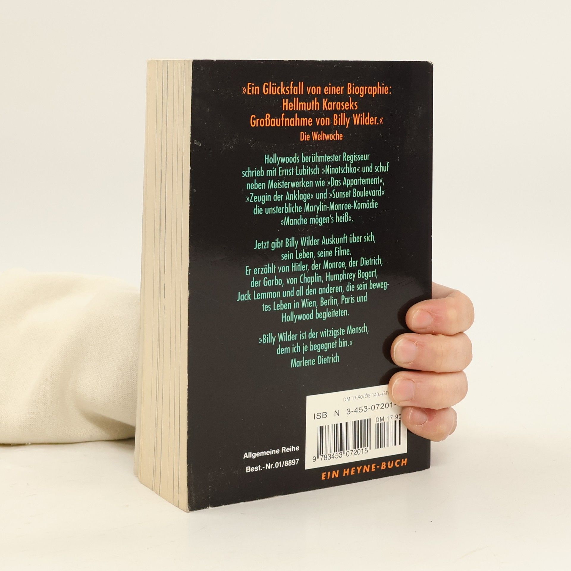 „Ein Glücksfall von einer Biographie: Hellmuth Karaseks Großaufnahme von Billy Wilder.“ DIE WELTWOCHE Jetzt gibt Billy Wilder Auskunft über sich, sein Leben, seine Filme. Er erzählt von Hitler, der Monroe, der Dietrich, der Garbo, von Chaplin, Humphrey Bogart, Jack Lemmon und all den anderen, die sein bewegtes Leben in Wien, Berlin, Paris und Hollywood begleiteten. „Billy Wilder ist der witzigste Mensch, dem ich je begegnet bin.“ Marlene Dietrich