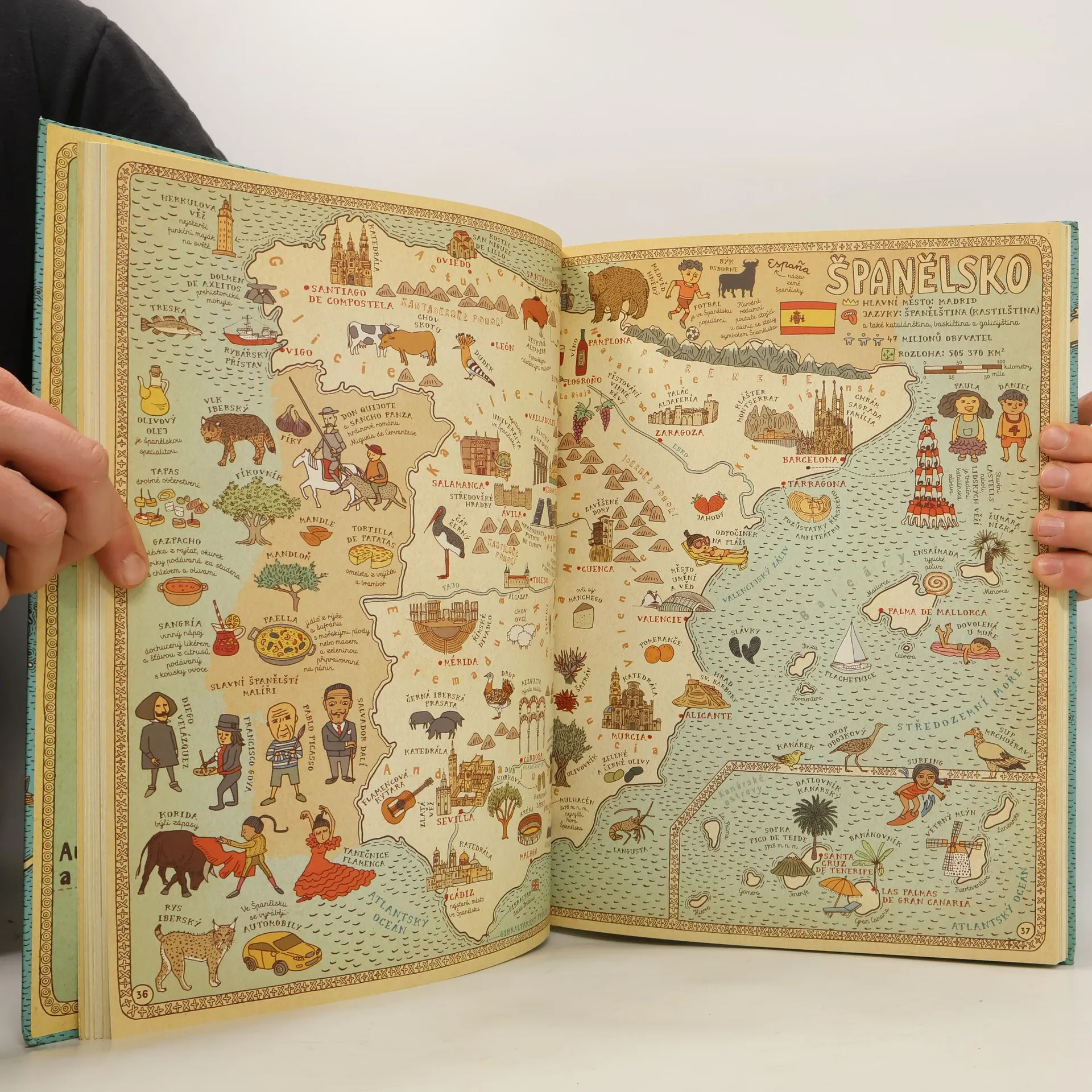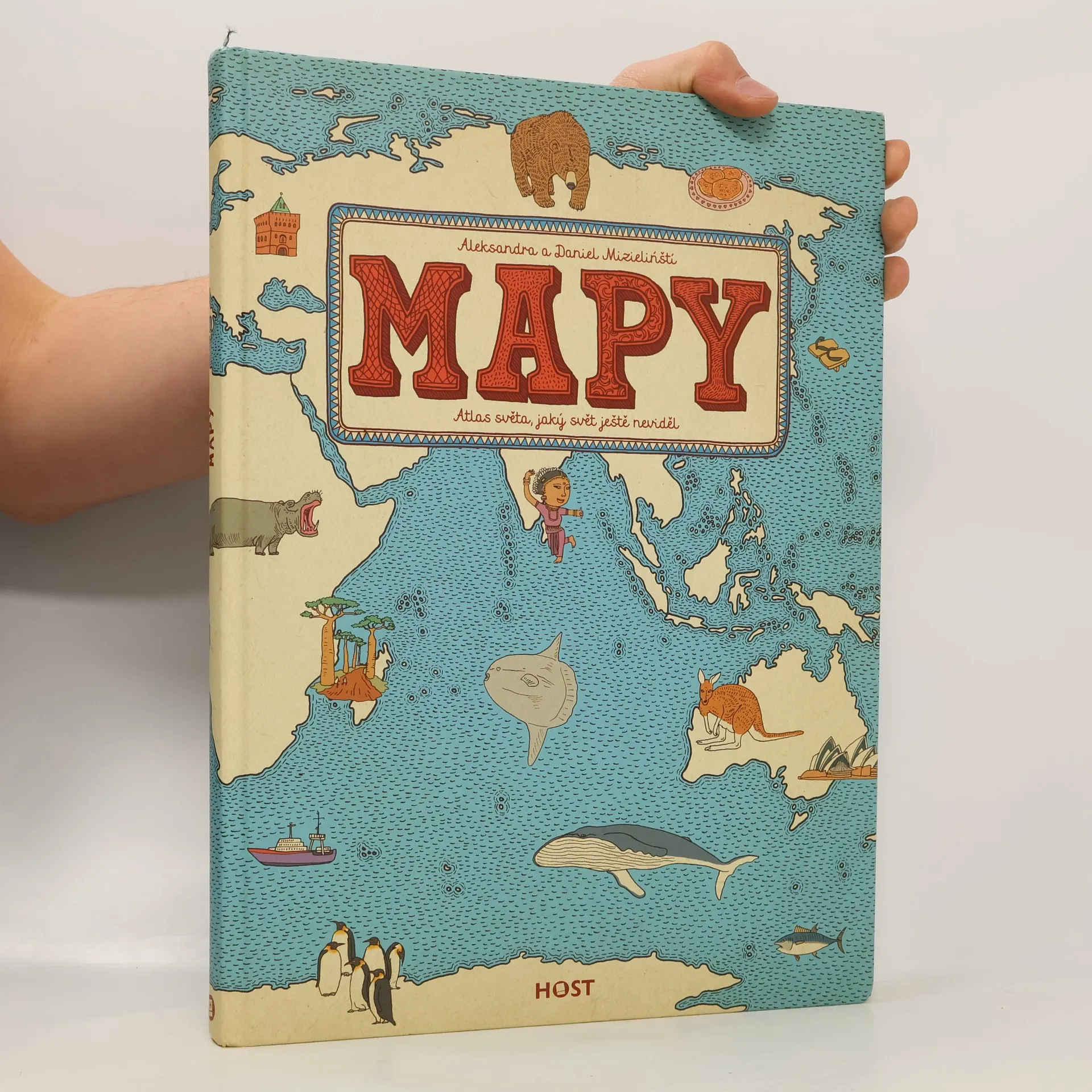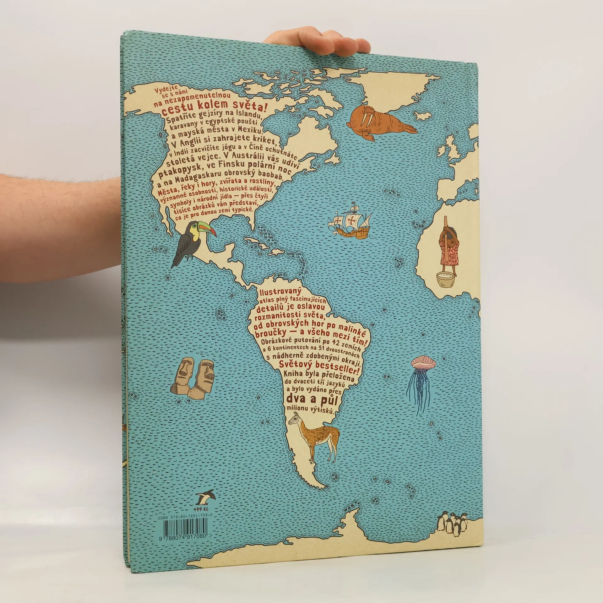 Vydejte se s námi na nezapomenutelnou cestu kolem světa... Spatříte gejzíry na Islandu, karavany v egyptské poušti a mayská města v Mexiku. V Anglii si zahrajete kriket, v Indii zacvičíte jógu a v Číně ochutnáte stoletá vejce. V Austrálii vás udiví ptakopysk, ve Finsku polární noc a na Madagaskaru obrovský baobab. Města, řeky i hory, zvířata a rostliny, významné osobnosti, historické události, symboly i národní jídla — přes čtyři tisíce obrázků vám představí, co je pro danou zemi typické. Obrázkové putování po dvaačtyřiceti zemích a šesti kontinentech na jednapadesáti dvoustranách s nádherně zdobenými okraji, které připomínají mapy dávných objevitelů a mořeplavců. Ilustrovaný atlas plný fascinujících detailů je oslavou rozmanitosti světa, od obrovských hor po malinké broučky — a všeho mezi tím. Atlas světa, jaký svět ještě neviděl!