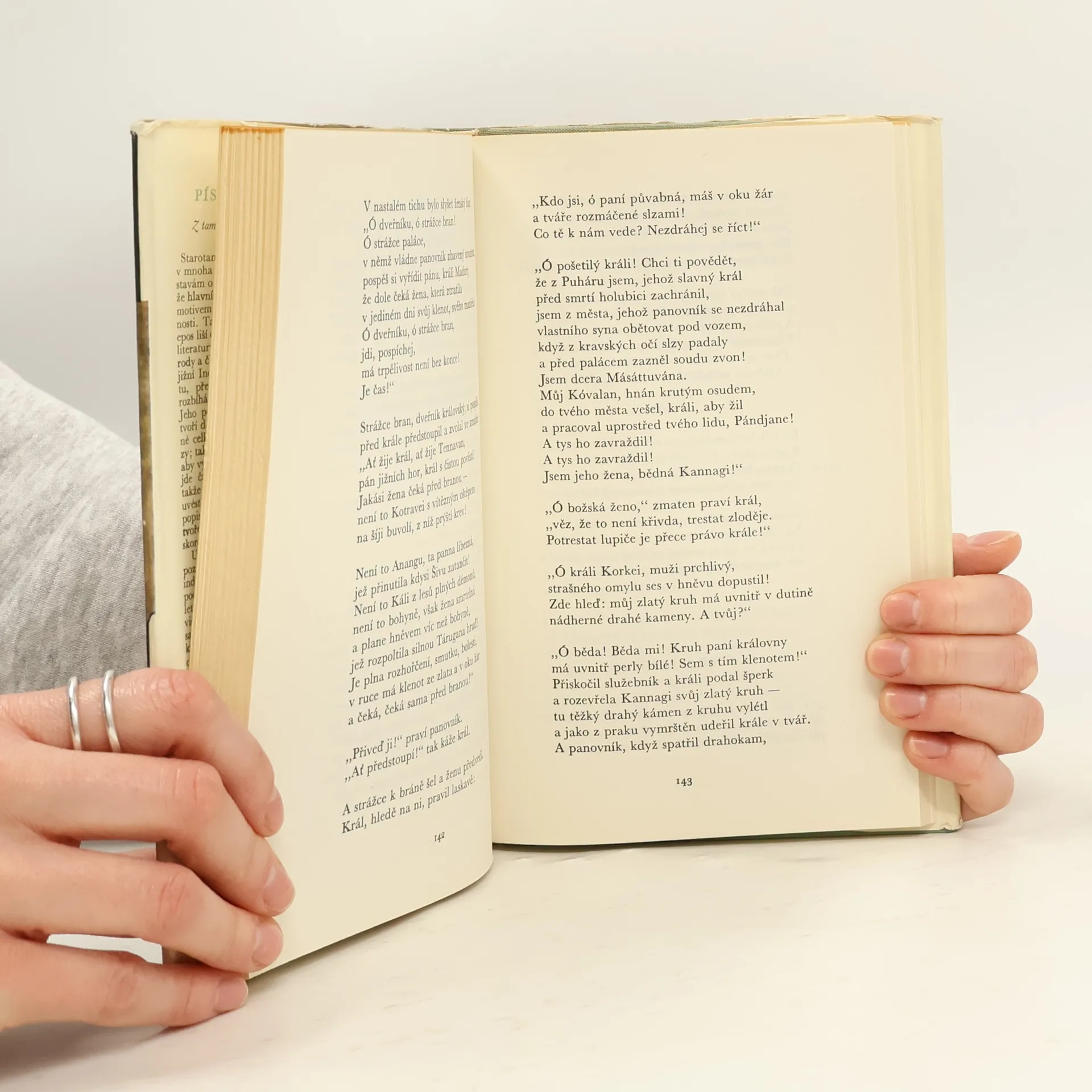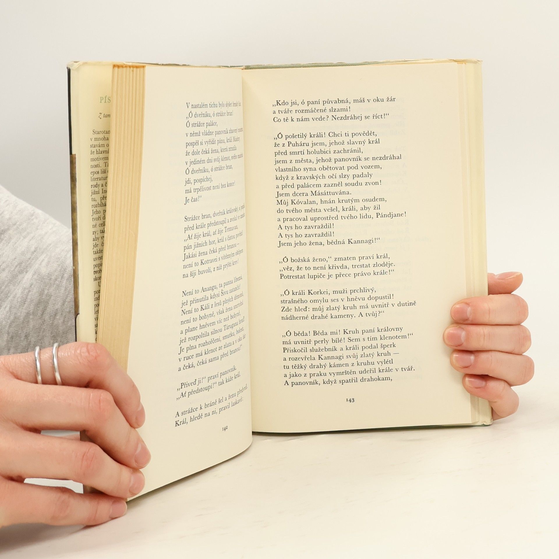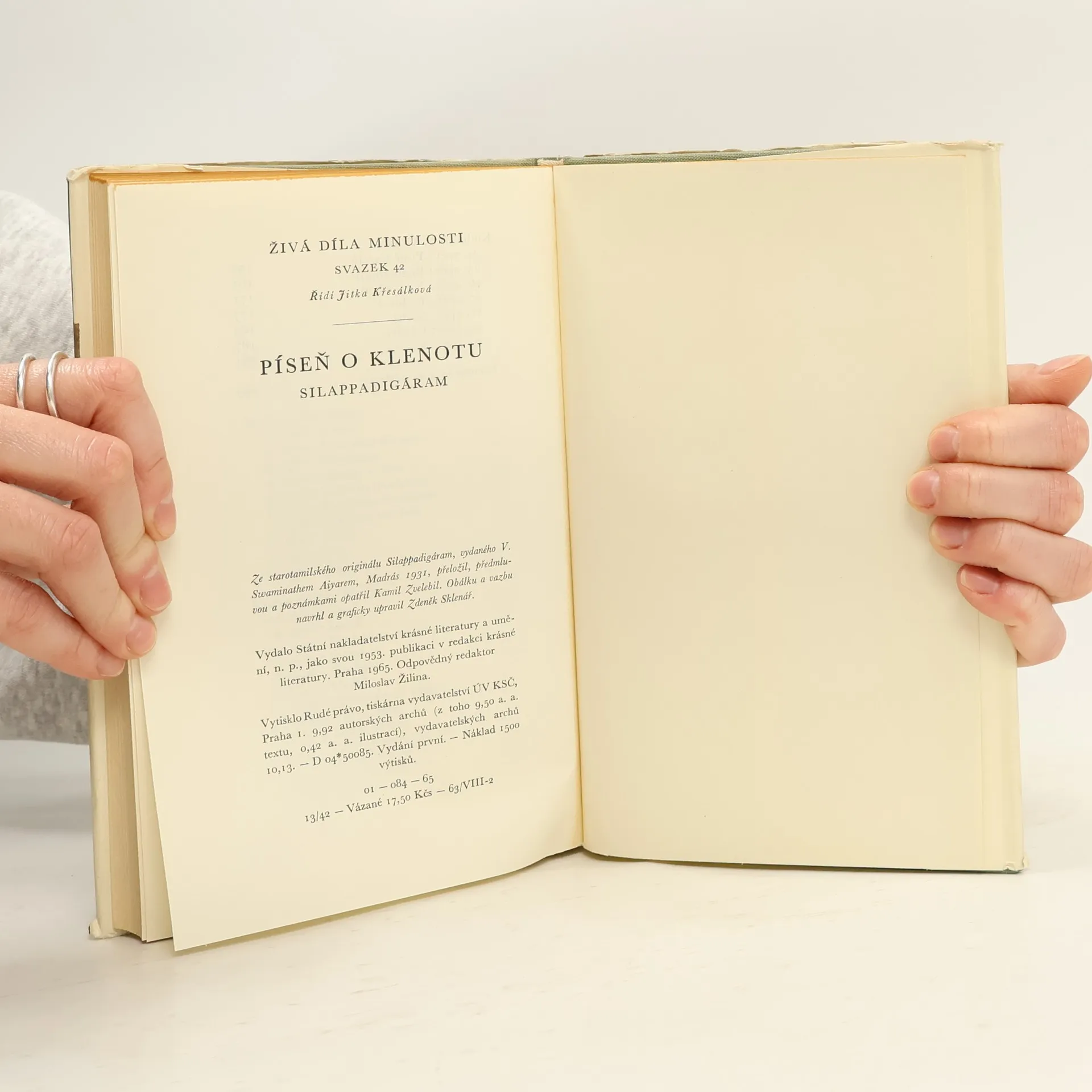 K dosavadní prozaické verzi anglické, francouzské a ruské důstojně se řadící první český veršovaný překlad jednoho z nejvýznamnějších a nejtypičtějších děl indické literatury z 5. až 6. století n.l., starotamilského eposu,vyznačujícího se hlubokým humanismem a demokratismem. Příběh statečné a věrné ženy, která se postaví proti královské nespravedlnosti, je prokládán poutavými obrazy indické přírody a společenského prostředí na počátku našeholetopočtu.