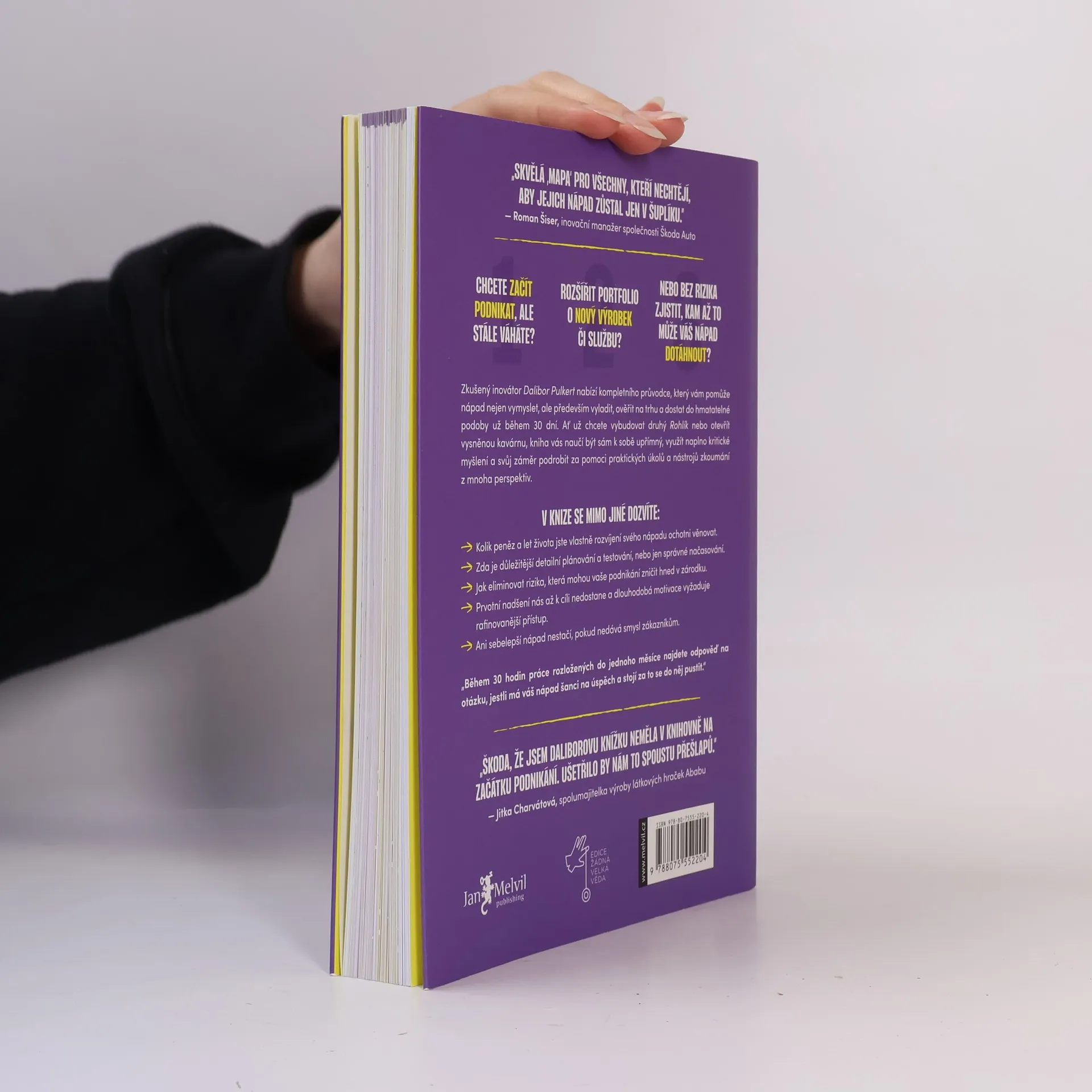 Máte nápad, nadšení a toužíte se vrhnout do světa podnikání? Nebo už se vám to daří a chcete své portfolio rozšířit o další výrobek či službu? Pak je načase začít tím nejdůležitějším, co vás už nyní může ochránit před budoucími těžkostmi či dokonce úplným neúspěchem azklamáním. Je čas na řádnou a svědomitou přípravu! Právě s tím vám pomůže vizuálně hravá a radami nabitá kniha Dalibora Pulkerta, která vás metodicky a krok za krokem provede vším, co budete k realizaci (nebo včasné změně!) svého nápadu potřebovat. Nebude to však zadarmo. Bude to vyžadovat kritické myšlení, empatii, upřímné odpovědi, kreativitu a plnění úkolů, které vás donutí podrobit svůj záměr zkoumání z mnoha perspektiv.