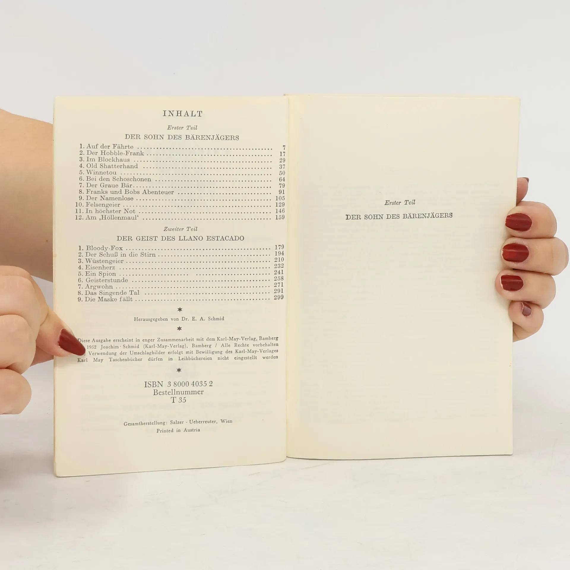 Zwei fesselnde Wildwest-Erzählungen in einem Band, die Karl May speziell für die Jugend geschrieben hat: 1.) Der Sohn des Bärenjägers 2.) Der Geist des Llano Estacado Skrupellose menschliche 'Geier' sind es, denen sich in den wilden Felsschluchten der Rocky Mountains („Der Sohn des Bärenjägers“) und in der Wüsteneinöde des Llano Estacado („Der Geist des Llano Estacado“) nicht nur die jugendlichen Helden Martin Baumann und Bloody Fox entgegenstellen, sondern auch die legendären Blutsbrüder Winnetou und Old Shatterhand. Damit neben der Spannung auch der Humor nicht zu kurz kommt, stehen ihnen noch die skurilen Westmänner 'Dicker Jemmy' und 'Langer Davy' und auch der unvergleichliche Hobble-Frank zur Seite.