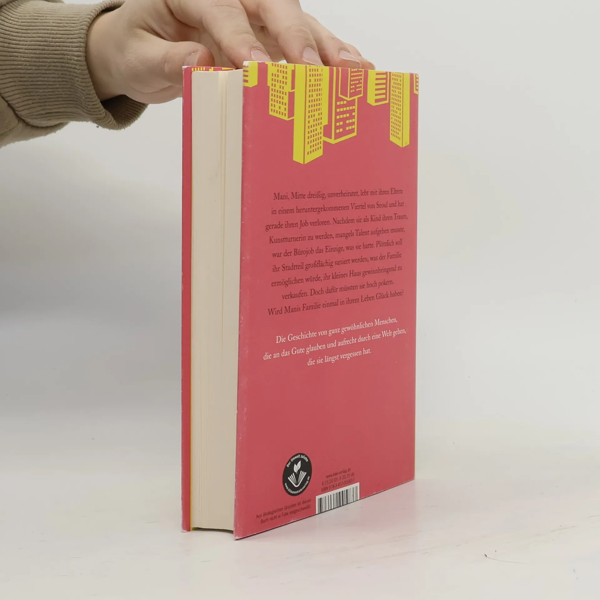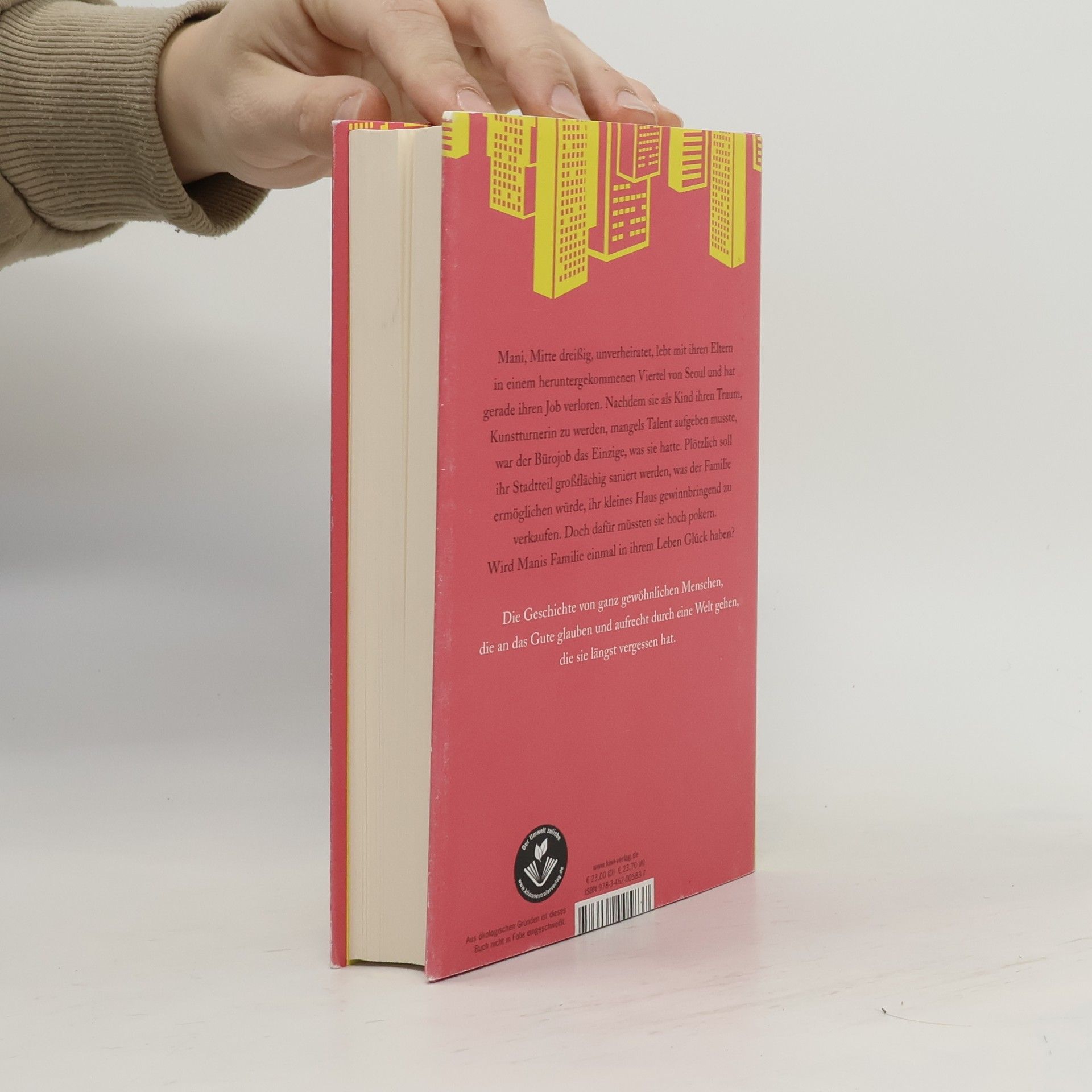 Die koreanische Bestsellerautorin Cho Nam-Joo widmet sich in diesem Entwicklungsroman einem Frauenleben, das geprägt ist von Armut und der immensen Scham, mit Mitte 30 noch unverheiratet zu sein. Manis Familie lebt in einem der ärmsten Stadtteile von Seoul. Ihr Vater arbeitet in einem Imbiss und ihre Mutter ist erwerbslos. Als kleines Mädchen träumte Mani davon, rhythmische Sportgymnastin zu werden, inspiriert durch Fernsehbilder der Olympischen Spiele 1988 in Seoul. Als Kind fängt sie mit dem Turnen an, muss aber schnell einsehen, dass sie im Vergleich zu anderen kein Talent hat. Sie wird ein einfaches, unerfülltes Leben führen, auch geprägt von der Demütigung, mit Mitte dreißig noch keine eigene Familie zu haben. Die Nachricht von der Stadtteilsanierung lässt die Immobilienpreise in die Höhe schießen, gleichzeitig erfährt Manis Familie zufällig, dass die Sanierung abgeblasen werden solle. Als ein Fremder ihr Haus kaufen will, ist die Familie uneins darüber, ob sie diesem gutmütigen Mann die Wahrheit sagen oder ihn täuschen soll. Ihr ganzes Leben lang haben sie sich an das Prinzip der Ehrlichkeit gehalten. Welche Entscheidung werden sie treffen, wenn sie vor dem größten Dilemma ihres Lebens stehen?