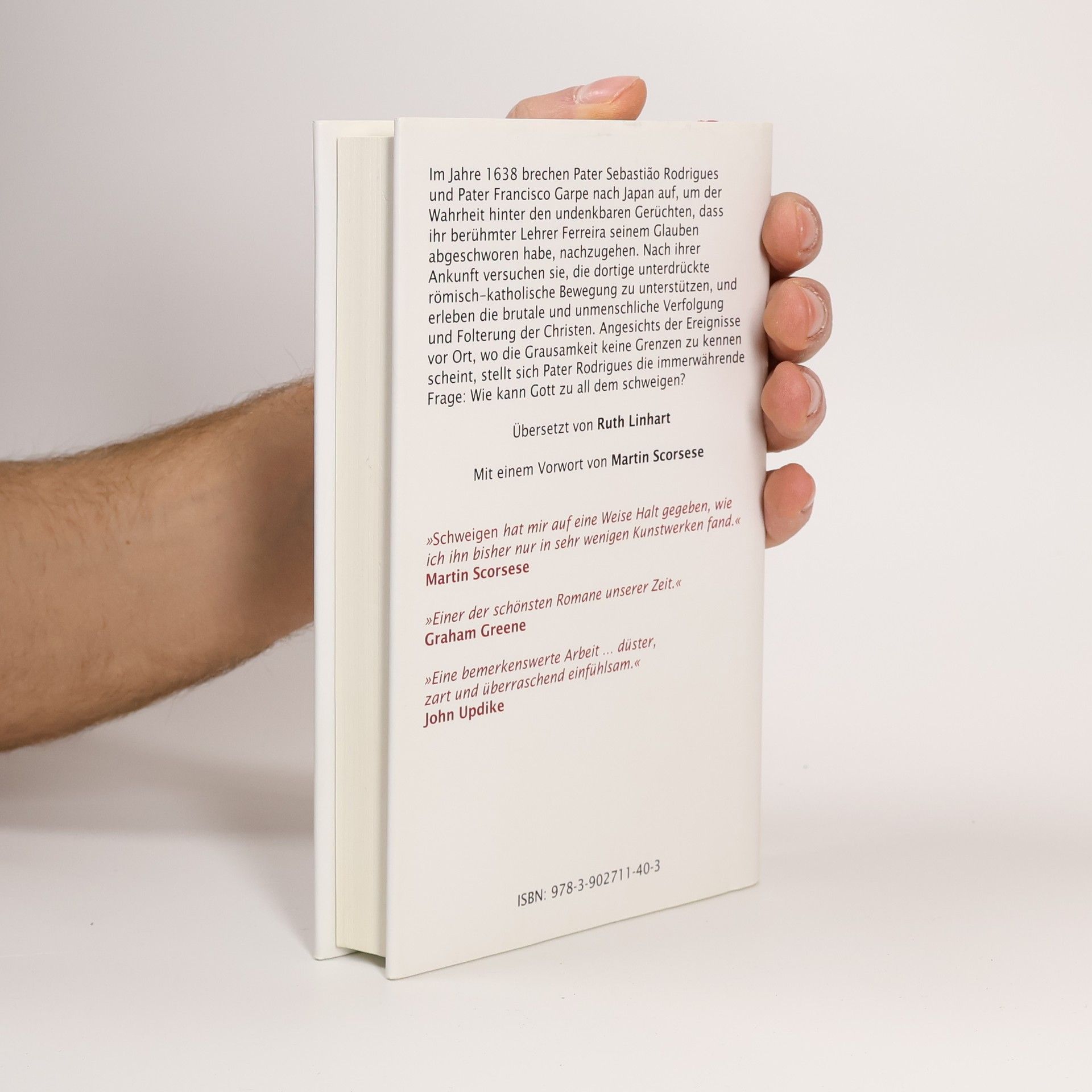 Schweigen ist der wichtigste Roman des gefeierten japanischen Autors Shusaku Endo. Er verursachte nach seiner Veröffentlichung im Jahr 1966 eine große Kontroverse in Japan. Shusaku Endo, ein japanischer Katholik, erzählt die Geschichte zweier portugiesischer Missionare, die im siebzehnten Jahrhundert in Japan versuchen, die dortige unterdrückte christliche Bewegung zu unterstützen. 1638 bricht Pater Sebastião Rodrigues nach Japan auf, um der Wahrheit hinter den undenkbaren Gerüchten, dass sein berühmter Lehrer Ferreira seinem Glauben abgeschworen habe, nachzugehen. Nach seiner Ankunft erlebt er die brutale und unmenschliche Verfolgung der Christen. Angesichts der Ereignisse in einer Gesellschaft, die keine Toleranz kennt und in der der Tod an der Tagesordung ist, stellt der Autor die immerwährende Frage: Wie kann Gott zu all dem schweigen? 2016 wird der Roman von Martin Scorsese mit Liam Neeson und Andrew Garfield in den Hauptrollen verfilmt.