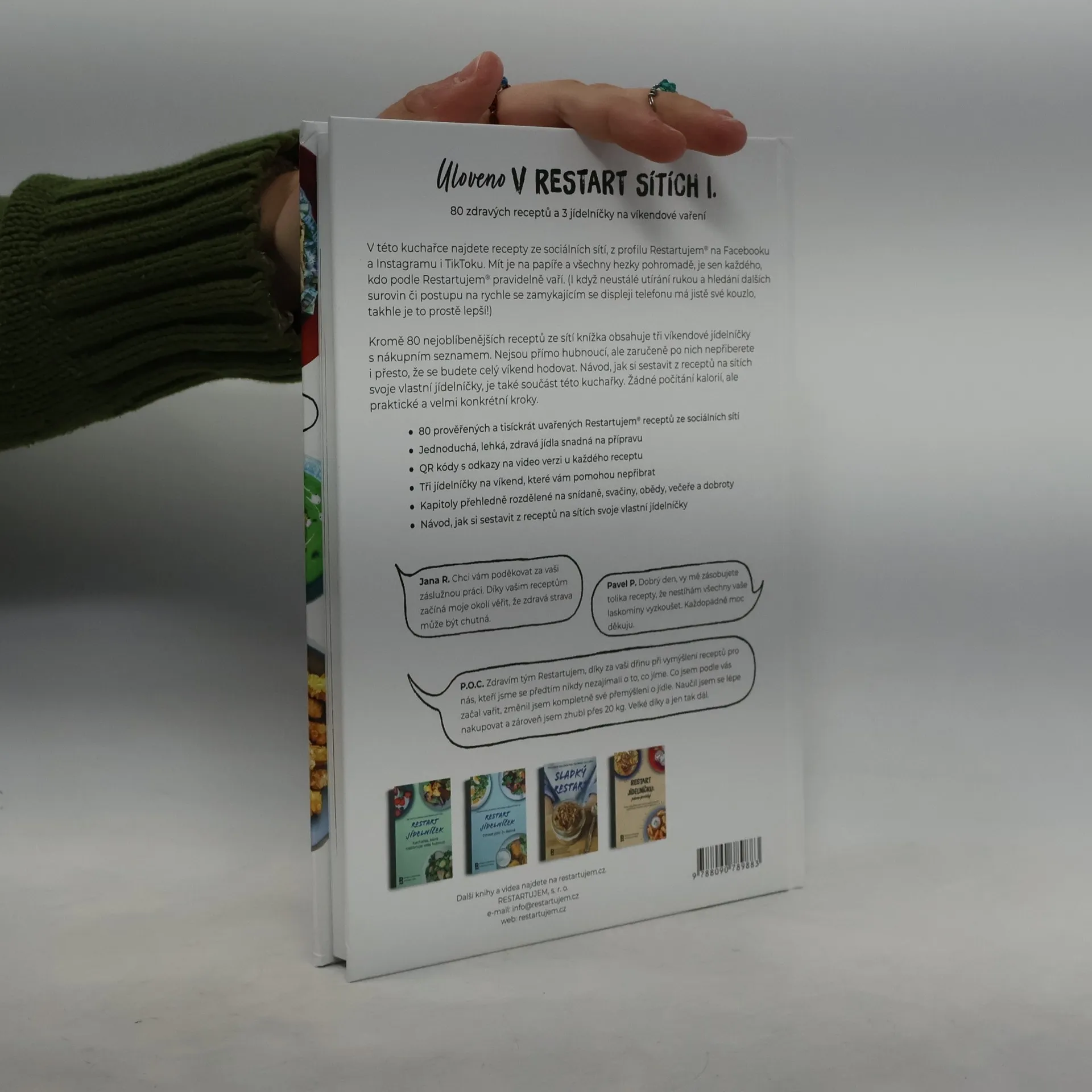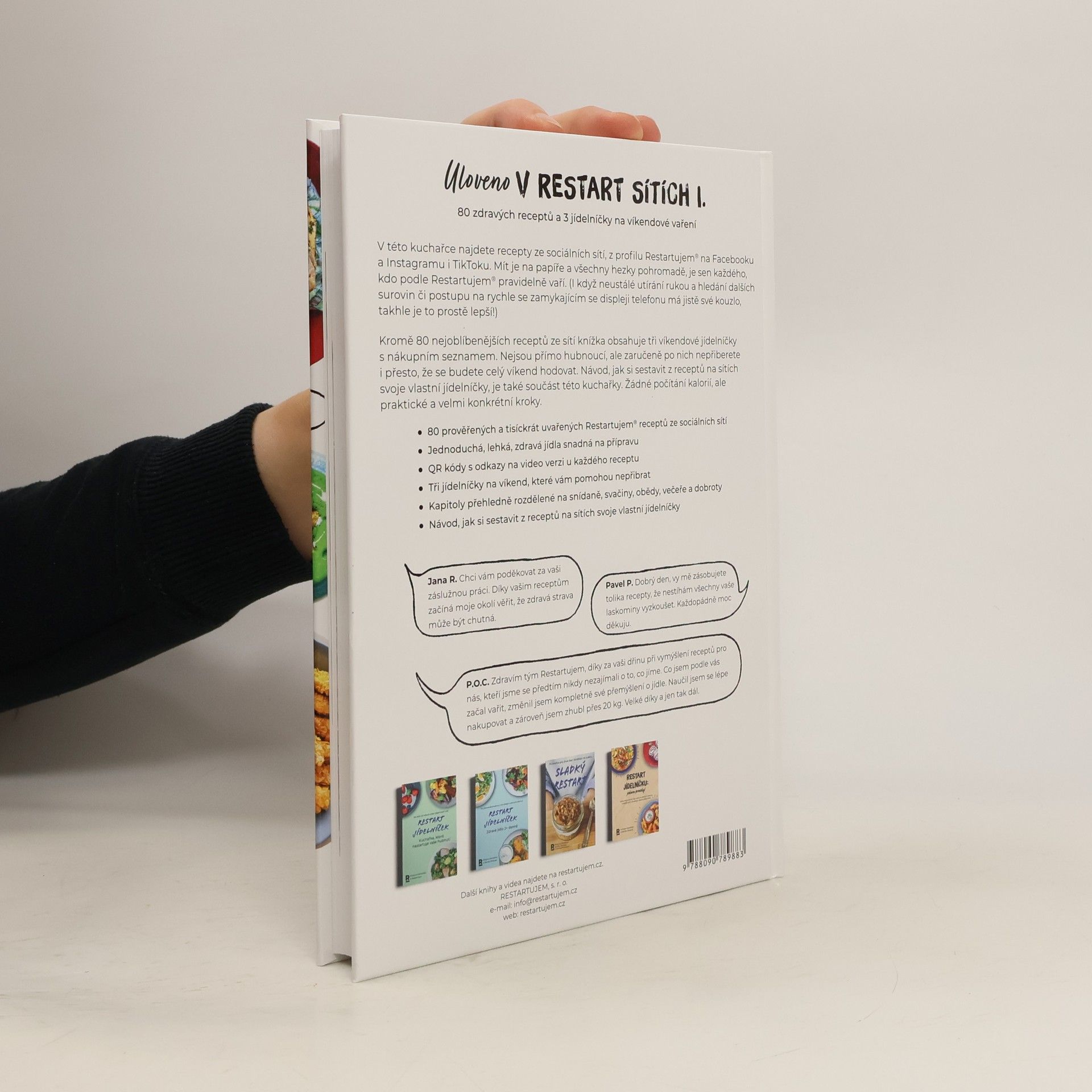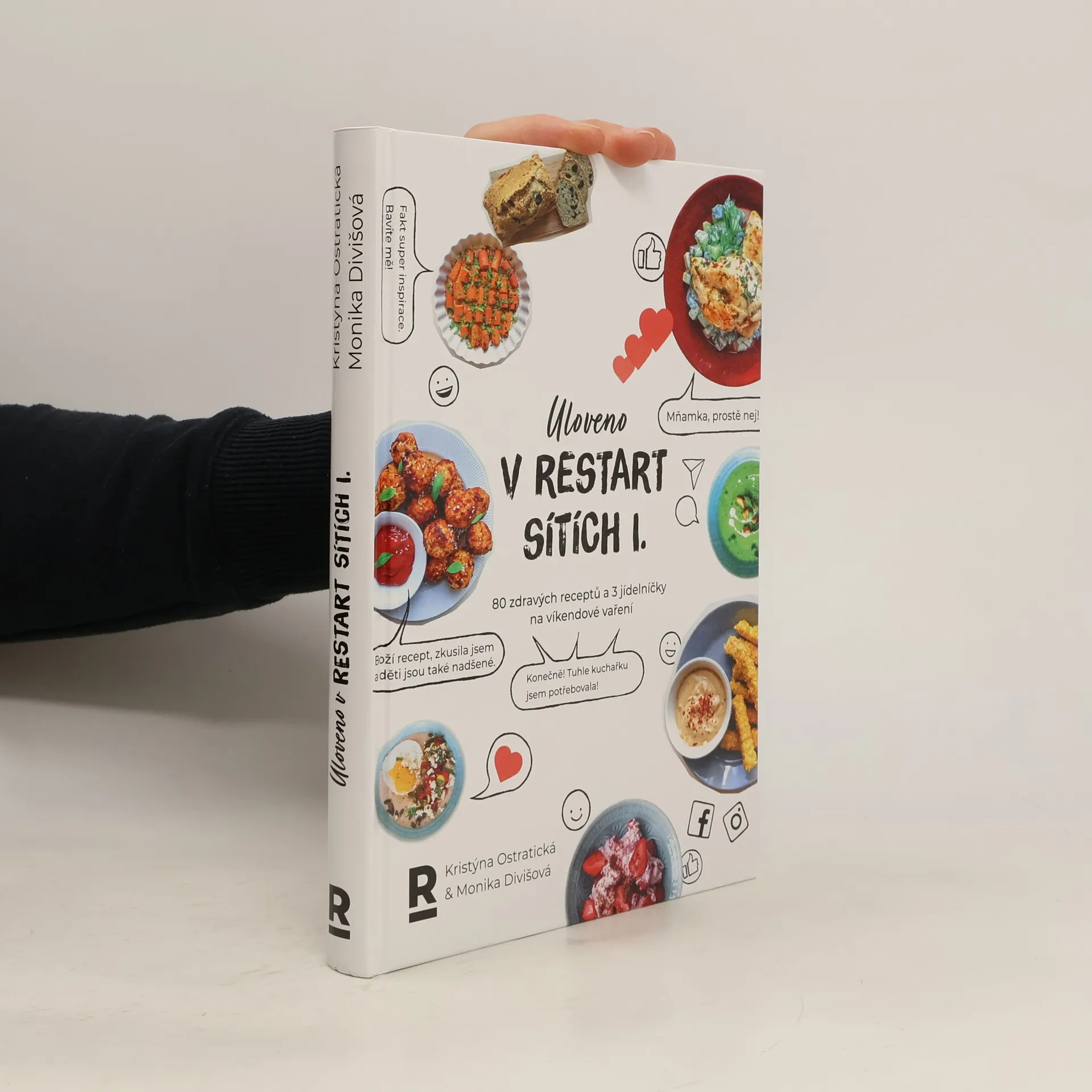 V této kuchařce najdete recepty ze sociálních sítí, z profilu Restartujem na Facebooku a Instagramu i TikToku. Mít je na papíře a všechny hezky pohromadě, je sen každého, kdo podle Restartujem pravidelně vaří. I když neustálé utírání rukou a hledání dalších surovin či postupu na rychle se zamykajícím displeji telefonu má jistě své kouzlo, takhle je to prostě lepší. Kromě 80 nejoblíbenějších receptů ze sítí knížka obsahuje tři víkendové jídelníčky s nákupním seznamem. Nejsou přímo hubnoucí, ale zaručeně po nich nepřiberete i přesto, že budete celý víkend hodovat. Návod, jak si sestavit z receptů na sítích svoje vlastní jídelníčky, je také součást této kuchařky. Žádné počítání kalorií, ale praktické a velmi konkrétní kroky.