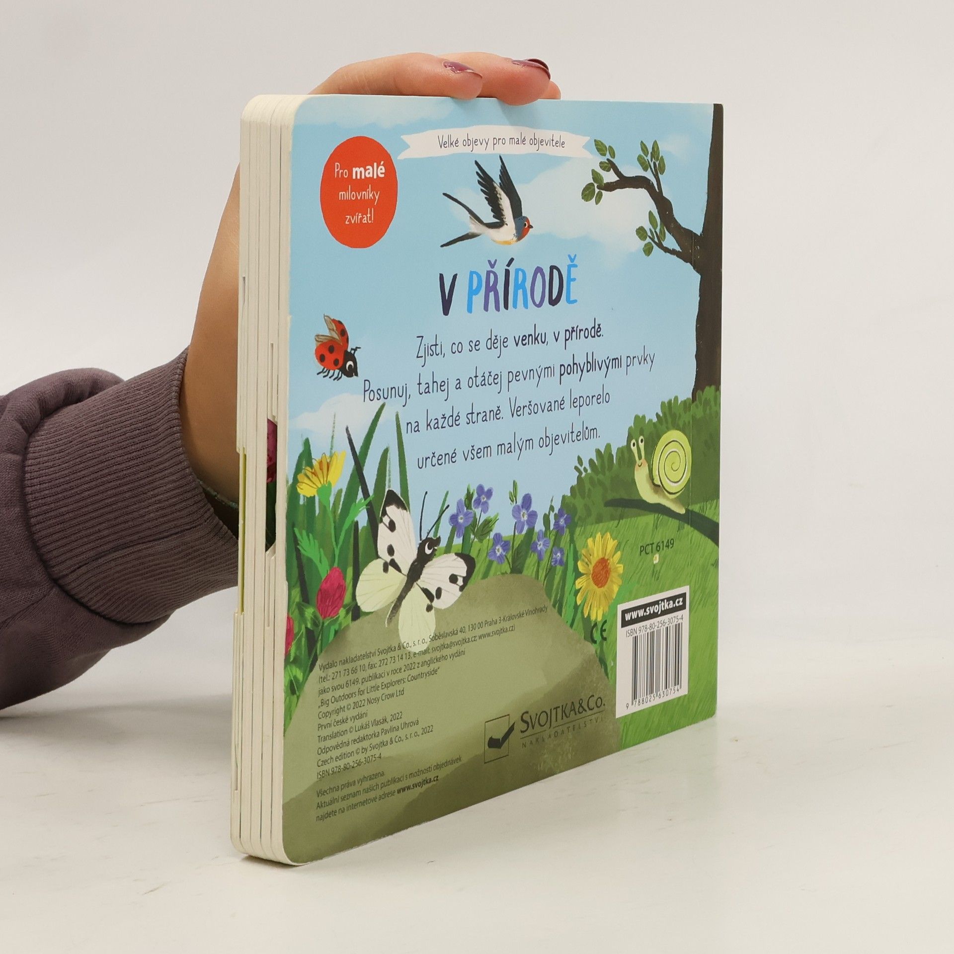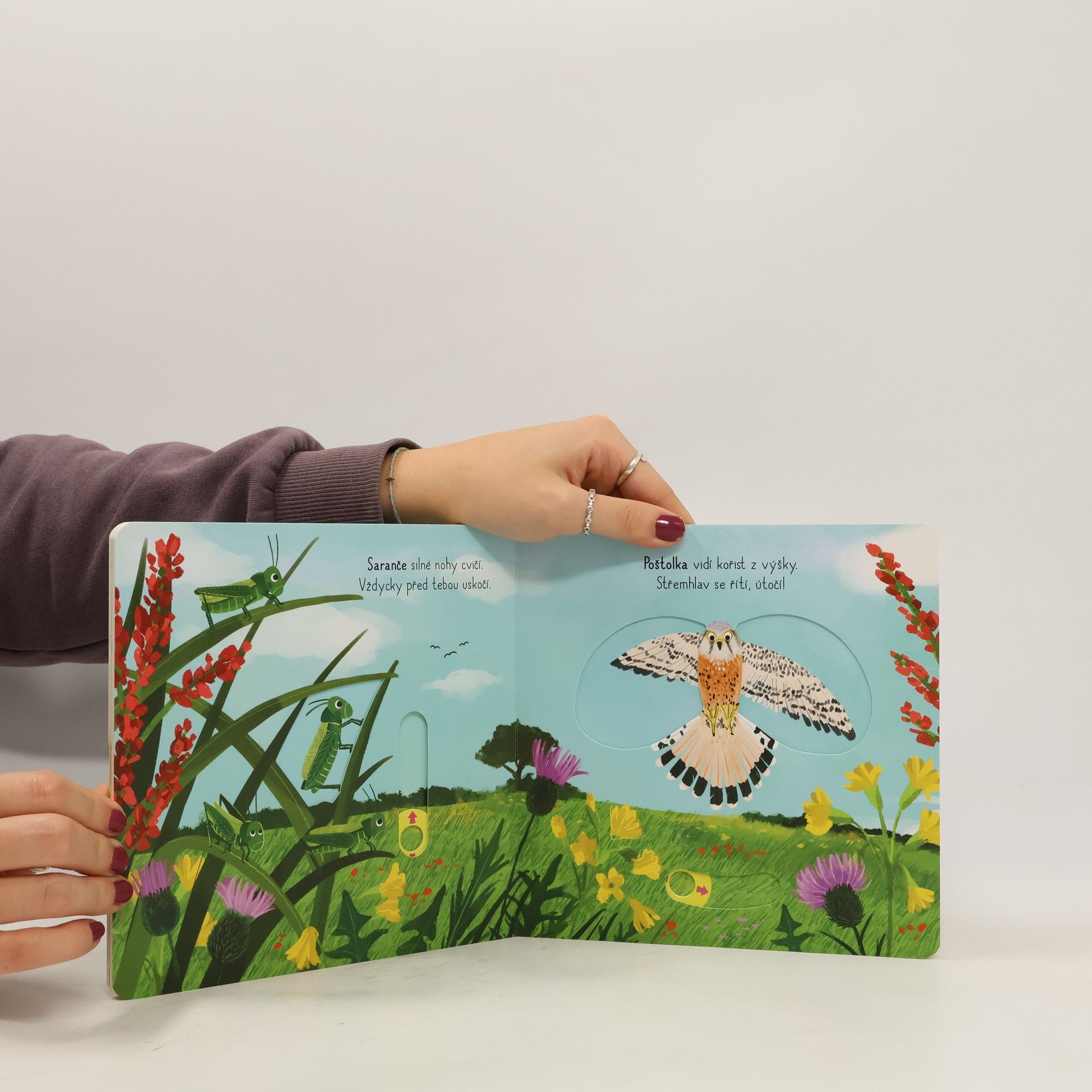 Zjisti, co se děje venku, v přírodě. Posunuj, tahej a otáčej pevnými pohyblivými prvky na každé straně. Veršované leporelo určené všem malým objevitelům.