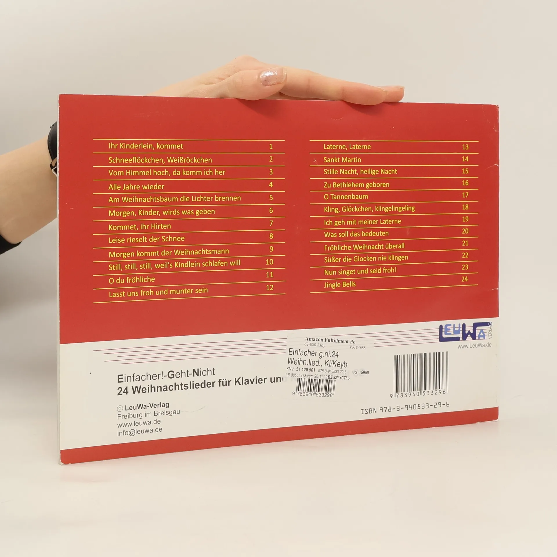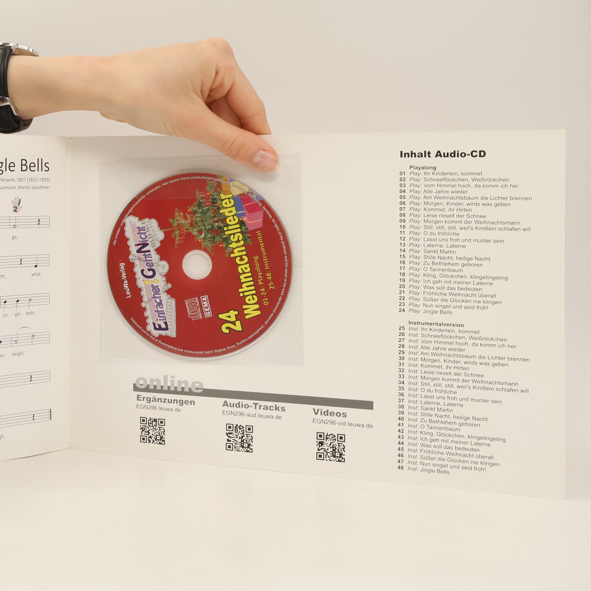 Einfacher geht es nicht: Die 24 schönsten Weihnachtslieder mit einzigartiger Notationsergänzung, die von Einsteigern schnell auf dem Klavier oder Keyboard gespielt werden können – ganz ohne Notenkenntnisse. Spielerisch und nebenbei werden diese erlernt. Grafiken zeigen die Handpositionen und die anschlagenden Finger, sodass die Melodien schnell und mit viel Freude gespielt werden können. Ein besonderes Erlebnis ist das Mitspielen zum Play Along! Zu jedem Lied gibt es eine langsame Version mit Einzähl-Klick und eine schnellere Instrumentalversion für Fortgeschrittene. Der Verlag bietet zudem viele kostenlose Ergänzungen zum Download an: Begleitvideos mit nützlichen Tipps, Liedtexte, Noten mit Zweitstimmen und Klavierbegleitnoten. Die Lieder sind so arrangiert, dass sie mit anderen Instrumenten (Glockenspiel, Gitarre, Ukulele, etc.) zusammen gespielt werden können. Die Sammlung umfasst beliebte Weihnachtslieder wie „Ihr Kinderlein, kommet“, „Stille Nacht, heilige Nacht“ und „Jingle Bells“. Viel Spaß beim Spielen auf deinem Klavier oder Keyboard!