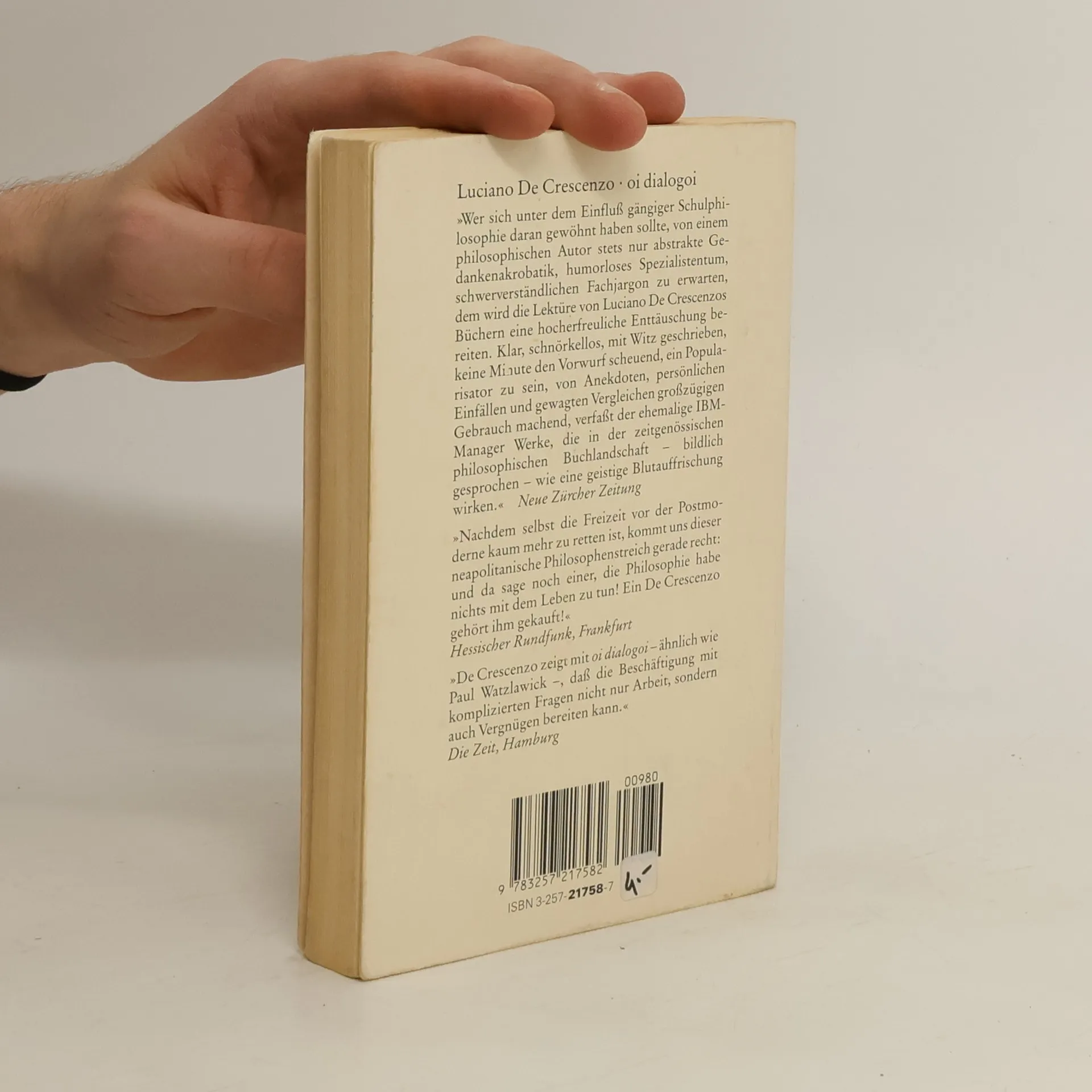 „oi dialogoi“, ein klassisch griechischer Titel für kurze, humoristisch angehauchte Erzählungen: über die Schönen Künste, Feuerwerke und Silvester, über Automobil- und Heiligenkult, Eigentumswohnungen, Gespenster, Wunder und Atomschutzanlagen; oder über die Schüchternheit, den Fußballstar Maradona und die grünen Männchen - jedenfalls über Neapel. Und die Kunst, miteinander zu reden.