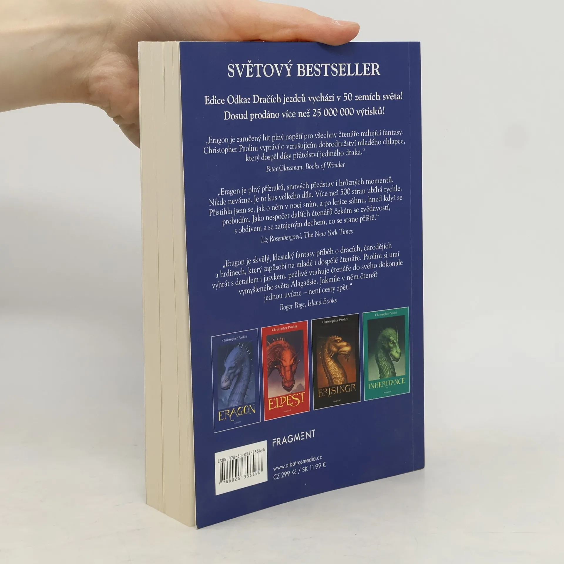 Jeden chlapec, jeden drak, svět dobrodružství. Fantasy bestseller Eragon z pera patnáctiletého Christophera Paoliniho, který nadchl miliony čtenářů po celém světě. Vypráví příběh chudého farmářského chlapce, který najde v Dračích horách modrý kámen, z něhož se vyklube dračí mládě - Safira. Spolu se vydají na nebezpečnou cestu královstvím ovládaným králem, jehož zlo nezná mezí. Dokáže Eragon naplnit své předurčení a převzít břímě legendárních Dračích jezdců? Osud království možná leží v jeho rukou ... První díl tetralogie Odkaz Dračích jezdců. ISBN 978-80-253-5858-0 (soubor 2022)