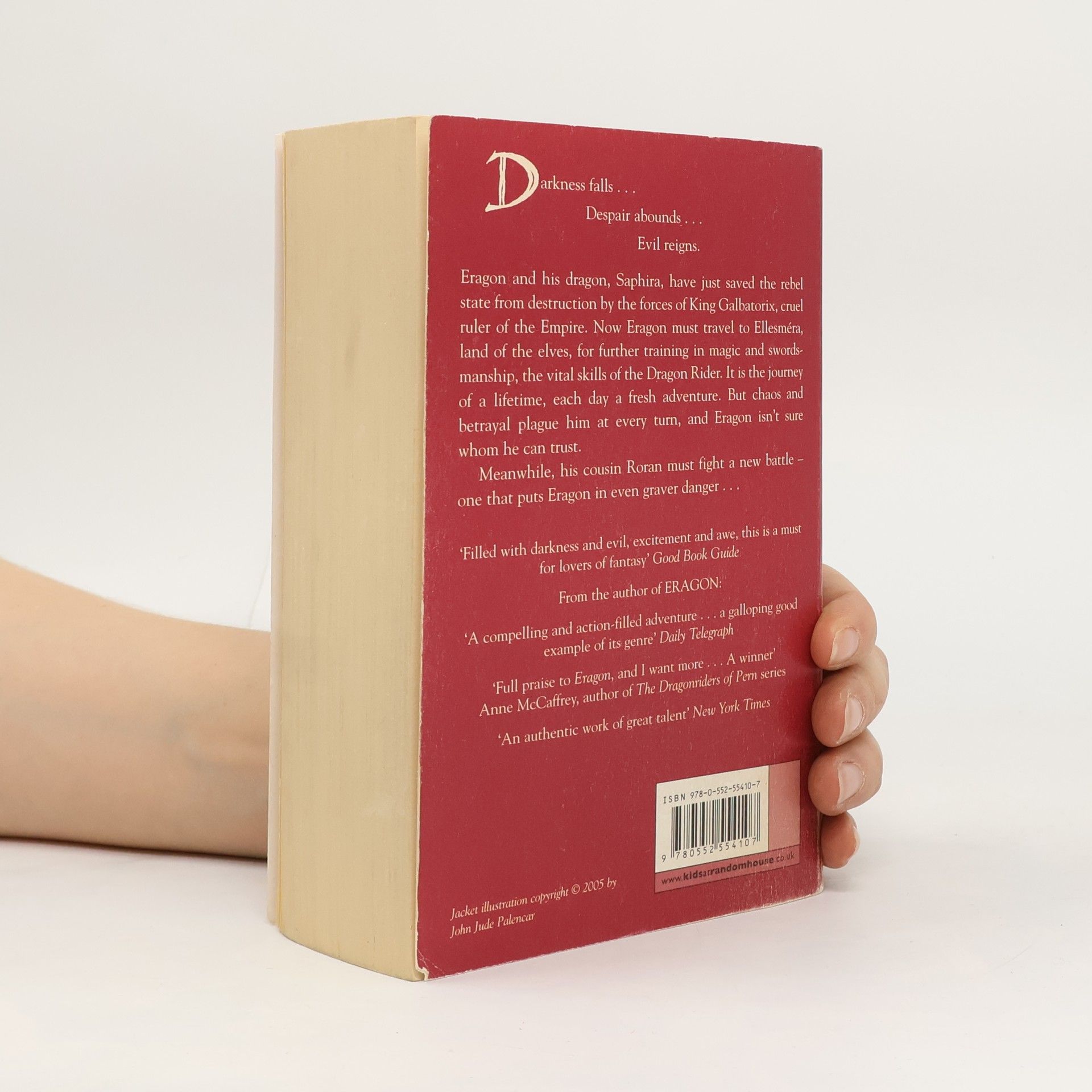 Darkness falls . . . Despair abounds . . . Evil reigns . . . Eragon and his dragon, Saphira, have just saved the rebel state from destruction by the mighty forces of King Galbatorix, cruel ruler of the Empire. Now Eragon must travel to Ellesm�ra, land of the elves, for further training in magic and swordsmanship, the vital skills of the Dragon Rider. It is the journey of a lifetime, filled with awe-inspiring new places and people, each day a fresh adventure. But chaos and betrayal plague him at every turn, and Eragon isn't sure whom he can trust. Meanwhile, his cousin Roran must fight a new battle back home in Carvahall - one that puts Eragon in even graver danger. Will the king's dark hand strangle all resistance? Eragon may not escape with even his life . . .