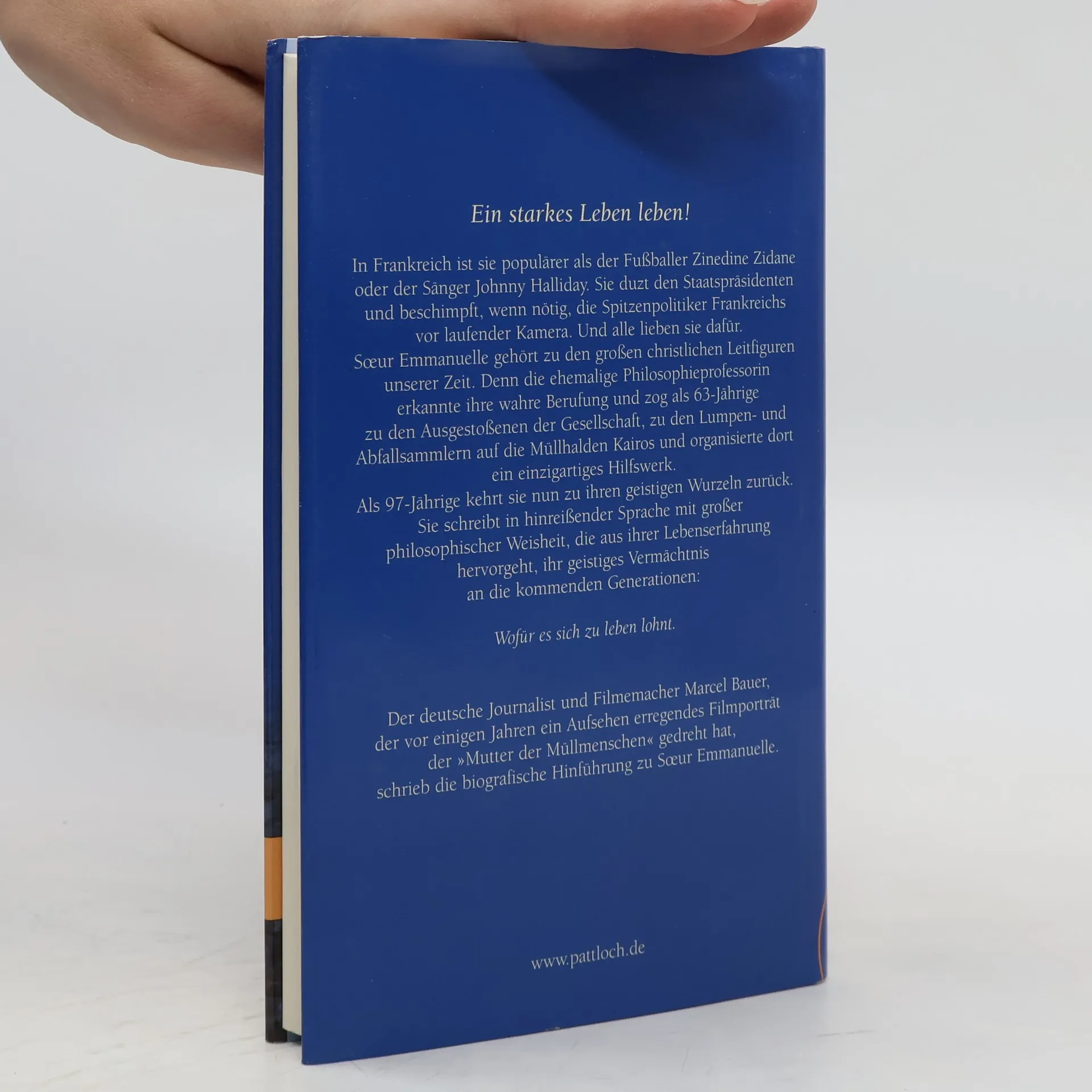 Schwester Emmanuelle gehört zu den großen christlichen Leitfiguren der heutigen Zeit. Im Alter von 95 Jahren hat sie ihr geistiges Vermächtnis geschrieben. Das Buch eroberte im Sturm die französische Bestsellerliste und wurde innerhalb weniger Monate über 160.000 Mal verkauft. Ausschlaggebend für diesen großen Erfolg ist wohl ihre faszinierende Biographie. Die hoch gebildete Philosophin machte im Alter von 63 Jahren eine radikale Lebenswende: 22 Jahre lang lebte sie aus purer Solidarität mit den Ärmsten der Armen auf den Müllhalden Kairos – und wurde weltweit als die »Mutter der Müllmenschen« bekannt. In junger, frischer Sprache gibt Schwester Emmanuelle ihre Lebensphilosophie wieder, die sie mit ihrem atemberaubenden Lebensweg zu verbinden versucht. Daraus entstand ein Buch, in dem sie ihre Erkenntnisse – wofür es sich zu leben lohnt – einer jungen Generation mit auf den Weg gibt.