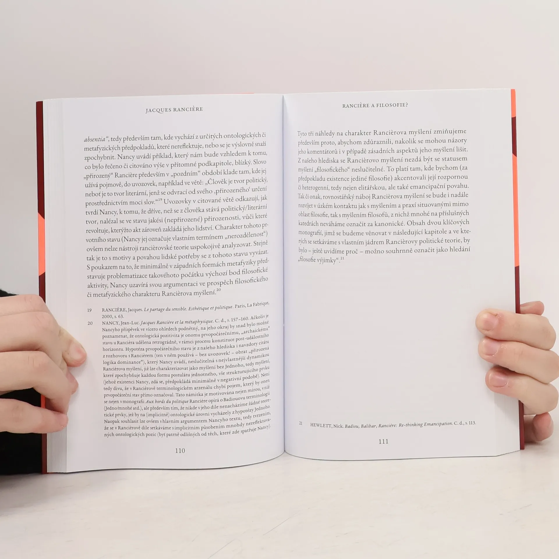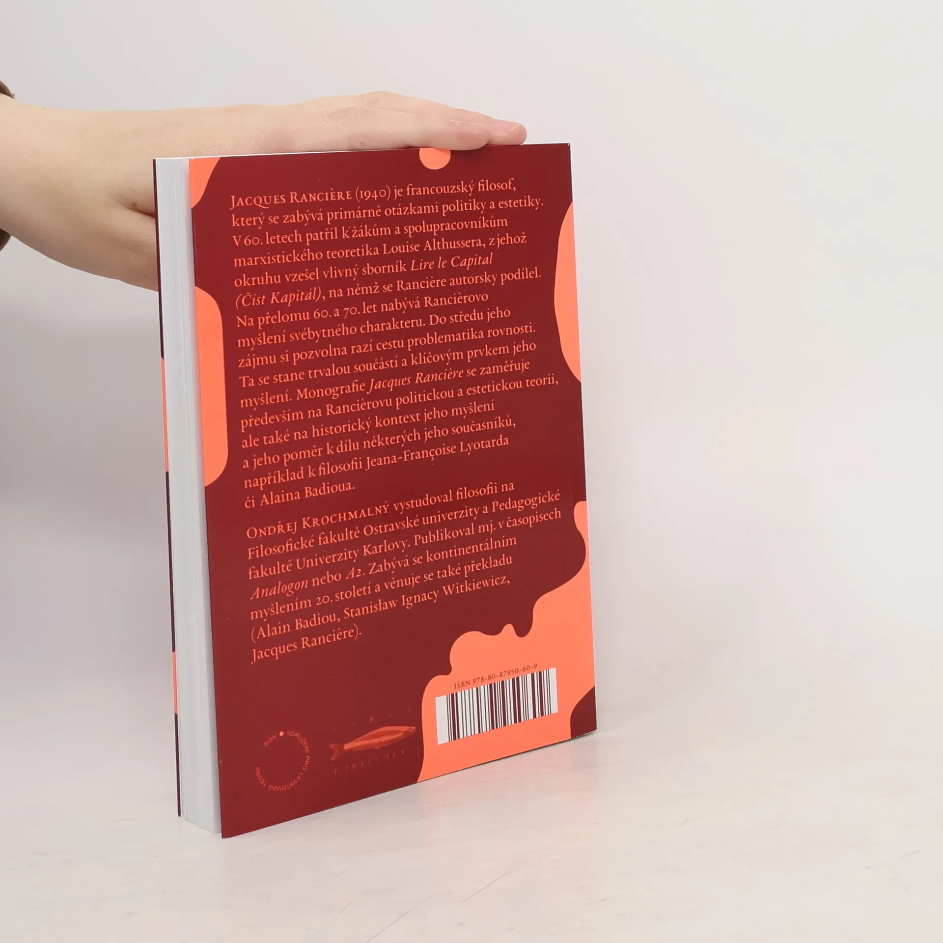 Jacques Ranciere (1940) je francouzsky filosof, který se zabývá primárně otázkami politiky a estetiky. V 60. letech patřil k žákům a spolupracovníkům marxistického teoretika Louise Althussera, z jehož okruhu vzešel vlivný sborník Lire le Capital (Číst Kapitál), na němž se Ranciere autorsky podílel. Na přelomu 60. a 70. let nabývá Rancierovo myšlení svébytného charakteru. Do středu jeho zájmu si pozvolna razí cestu problematika rovnosti. Ta se stane trvalou součástí a klíčovým prvkem jeho myšlení. Monografie Jacques Ranciere se zaměřuje především na Rancierovu politickou a estetickou teorii, ale také na historický kontext jeho myšlení a jeho poměr k dílu některých jeho současníků, například k filosofii Jeana-Françoise Lyotarda či Alaina Badioua.