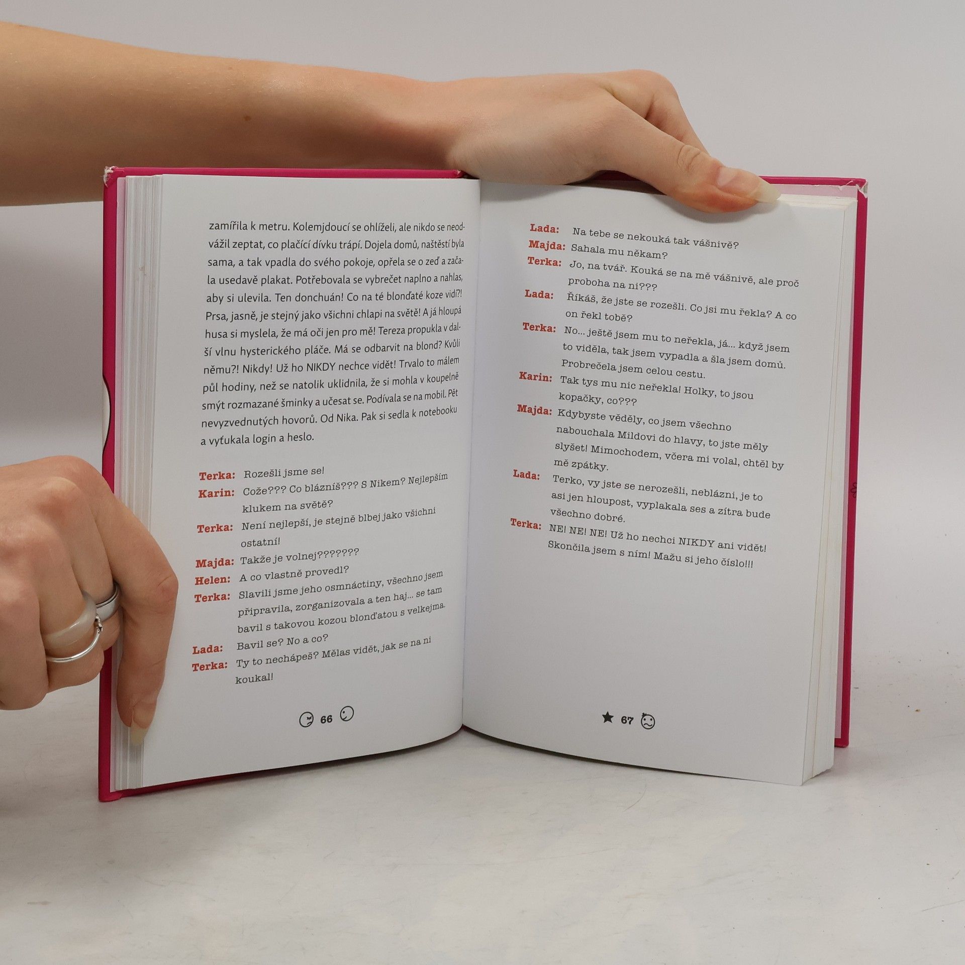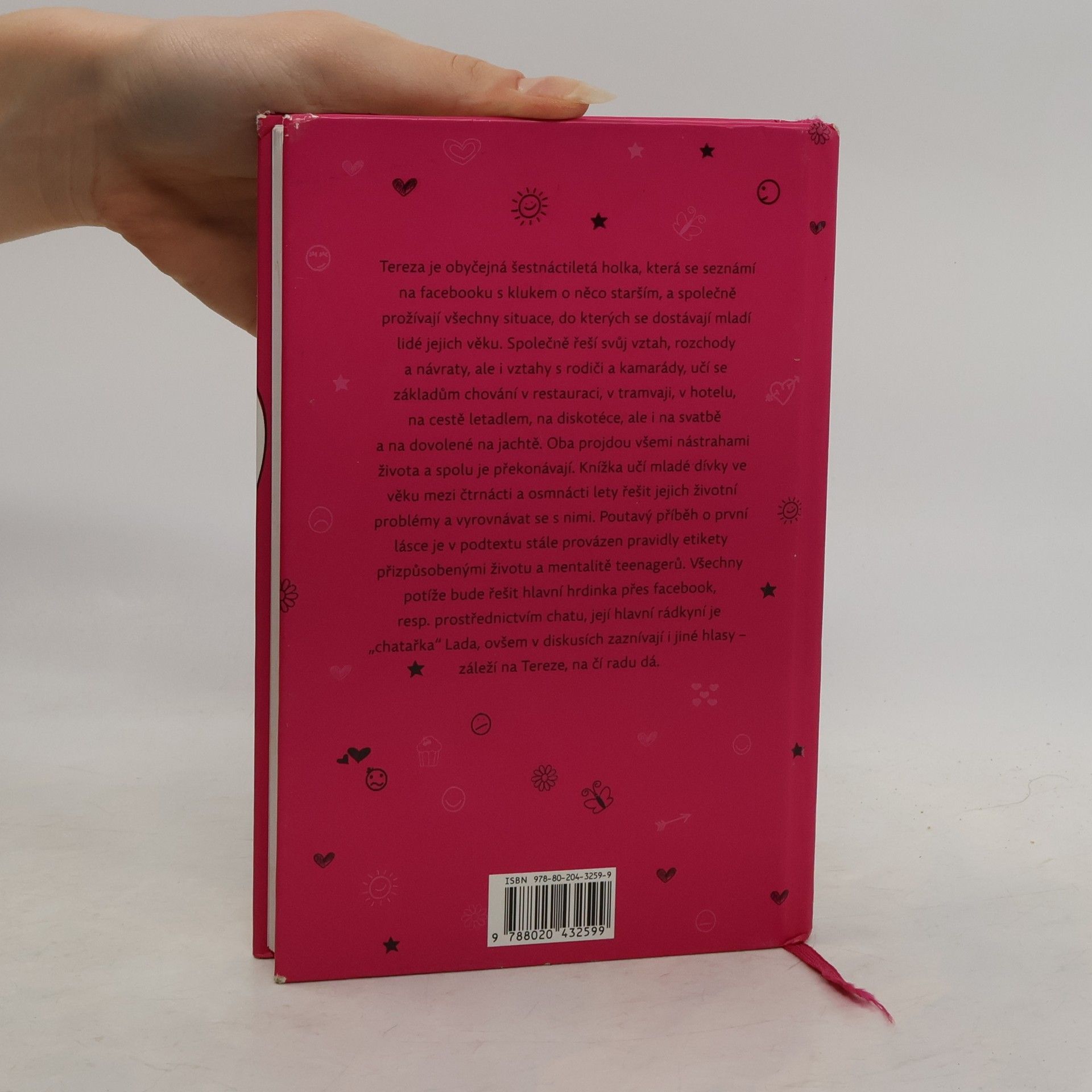 Tereza je obyčejná šestnáctiletá holka, která se seznámí na facebooku s klukem o něco starším, a společně prožívají všechny situace, do kterých se dostávají mladí lidé jejich věku. Společně řeší svůj vztah, rozchody a návraty, ale i chování k rodičům, ke kamarádům, učí se základům chování v restauraci, v tramvaji, v hotelu, na cestě letadlem, na diskotéce, ale i na svatbě a na společné dovolené na jachtě. Oba projdou všemi nástrahami života a společně se s nimi vyrovnávají. Knížka učí mladé dívky ve věku mezi čtrnácti a osmnácti lety řešit jejich životní problémy a vyrovnávat se s nimi. Poutavý příběh o první lásce je v podtextu stále provázen pravidly etikety přizpůsobenými životu a mentalitě teenagerů. Všechny potíže bude řešit hlavní hrdinka přes facebook, resp. prostřednictvím chatu, její hlavní rádkyní je „chatařka“ Lada, ovšem v diskusích zaznívají i jiné hlasy – záleží na Tereze, na čí radu dá.