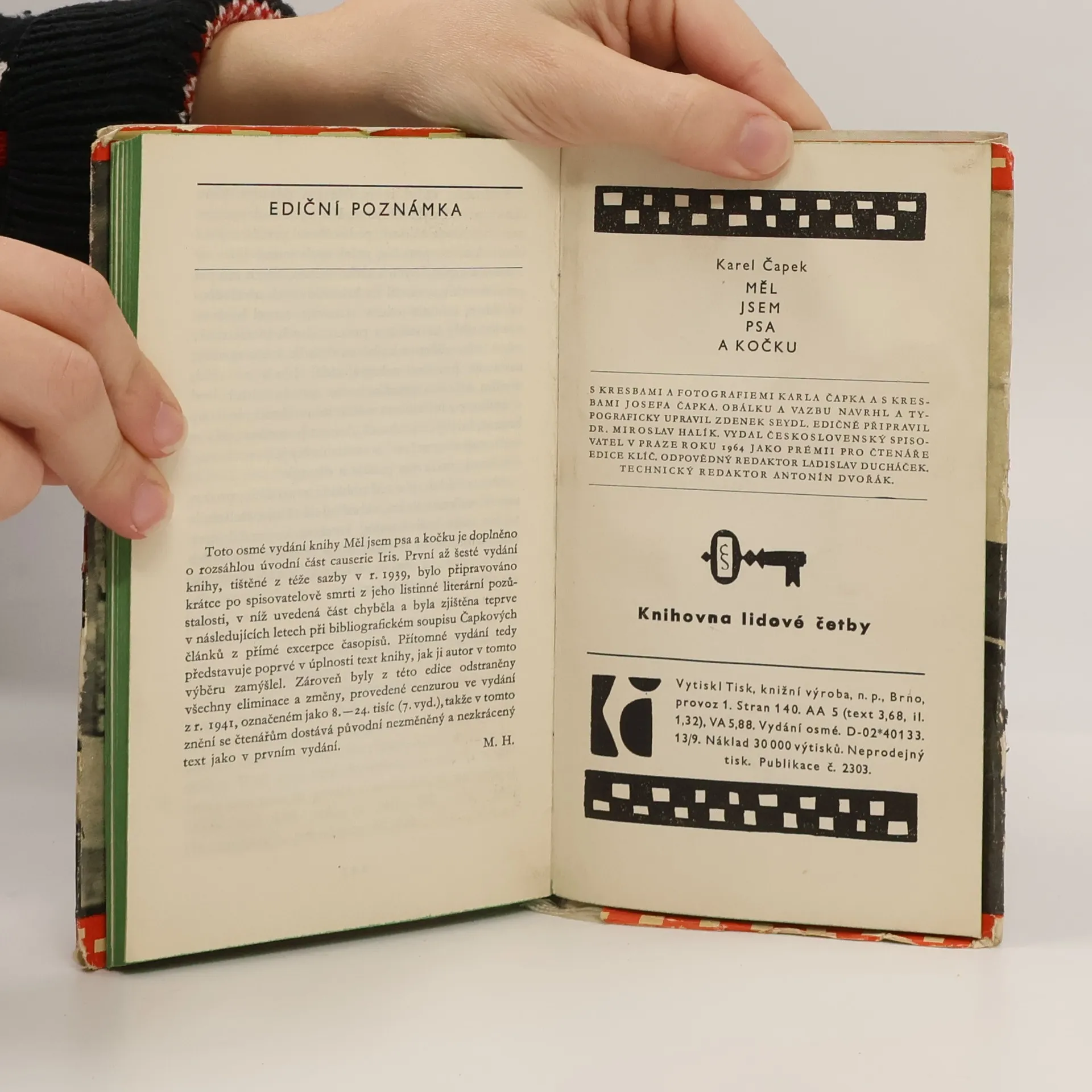 Rozmarné i vážné, vtipnými kresbami doprovázené vyprávění o radostech i trampotách, které do autorova života vneslo majetnictví psa a kočky. Je nejen brilantní ukázkou vypravěčského umění, ale i dokladem hlubokého porozumění pro zvířecí duši a postižení vztahu mezi člověkem a jehozvířecími přáteli. Ilustrace a fotografie Karel Čapek. Kresby Josef Čapek. Obálka, vazba a úprava Zdenek Seydl. Vyšlo jako neprodejná premie Klíč Ediční poznámka Vydání z r. 1964 (8. vydání) je narozdíl od předchozích (1. až 6. vydání) doplněno o rozsáhlou úvodní část causerie Iris, která v předchozích vydáních chyběla a byla zjištěna teprve v pozdějších letech při bibliografickém soupisu Čapkových článků z přímé excerpce časopisů. Toto vydání je tedy prvním úplným textem knihy, jak ji autor zamýšlel. Zároveň byly z edice odstraněny všechny eliminace a změny, provedené cenzurou ve vydání z r. 1941, označeném jako 8.-24. tisíc (7. vyd.), takže v tomto znění se čtenářům dostává původní nezměněný a nezkrácený text jako v prvním vydání.