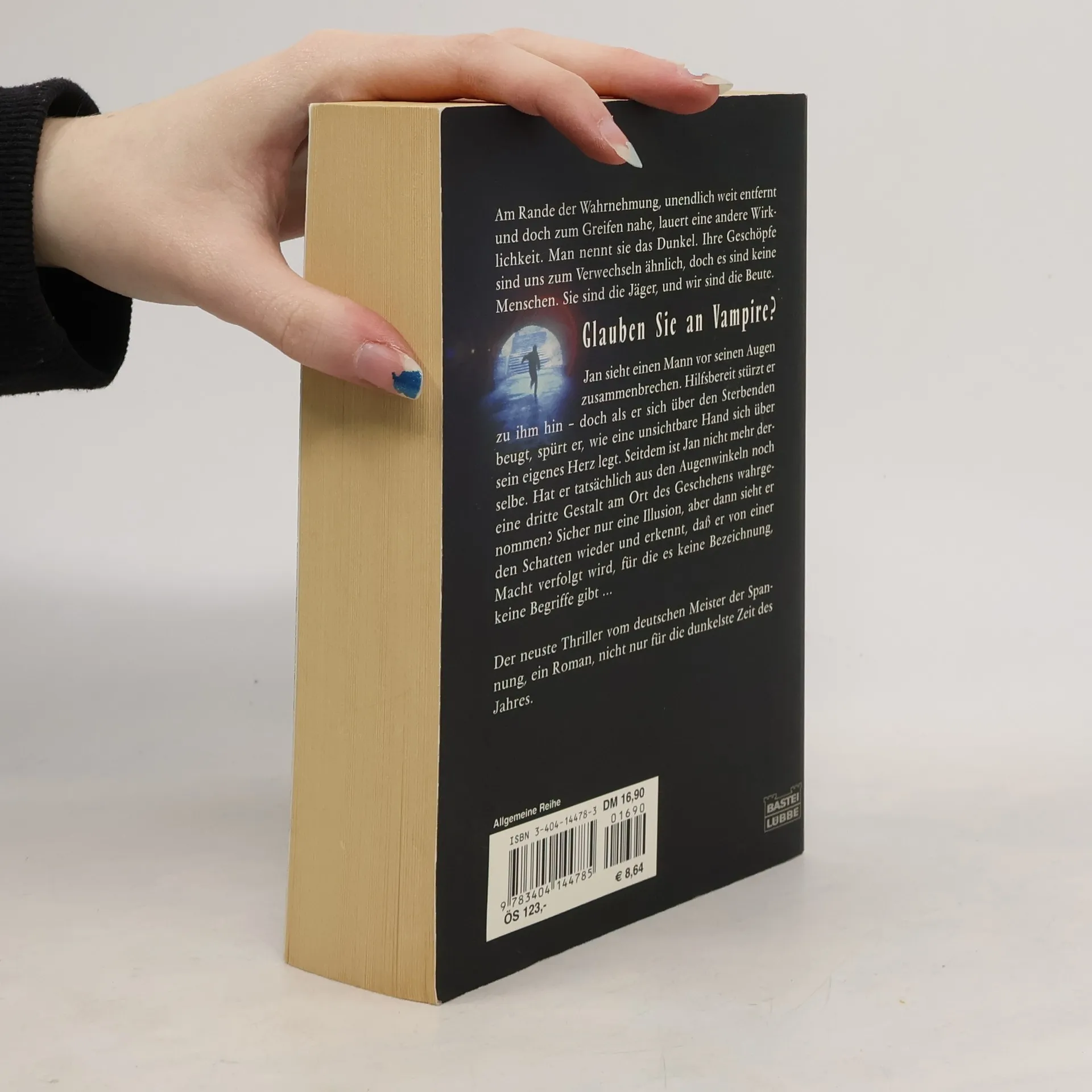 Am Rande der Wahrnehmung, unendlich weit entfernt und doch zum Greifen nahe, lauert eine andere Wirklichkeit. Man nennt sie das Dunkel. Ihre Geschöpfe sind uns zum Verwechseln ähnlich, doch es sind keine Menschen. Sie sind die Jäger, und wir sind die Beute. Glauben Sie an Vampire? Jan sieht einen Mann vor seinen Augen zusammenbrechen. Hilfsbereit stürzt er zu ihm hin - doch als er sich über den Sterbenden beugt, spürt er, wie eine unsichtbare Hand sich über sein eigenes Herz legt. Seitdem ist Jan nicht mehr derselbe. Hat er tatsächlich aus den Augenwinkeln noch eine dritte Gestalt am Ort des Geschehens wahrgenommen? Sicher nur eine Illusion, aber dann sieht er den Schatten wieder und erkennt, daß er von einer Macht verfolgt wird, für die es keine Bezeichnung, keine Begriffe gibt ...