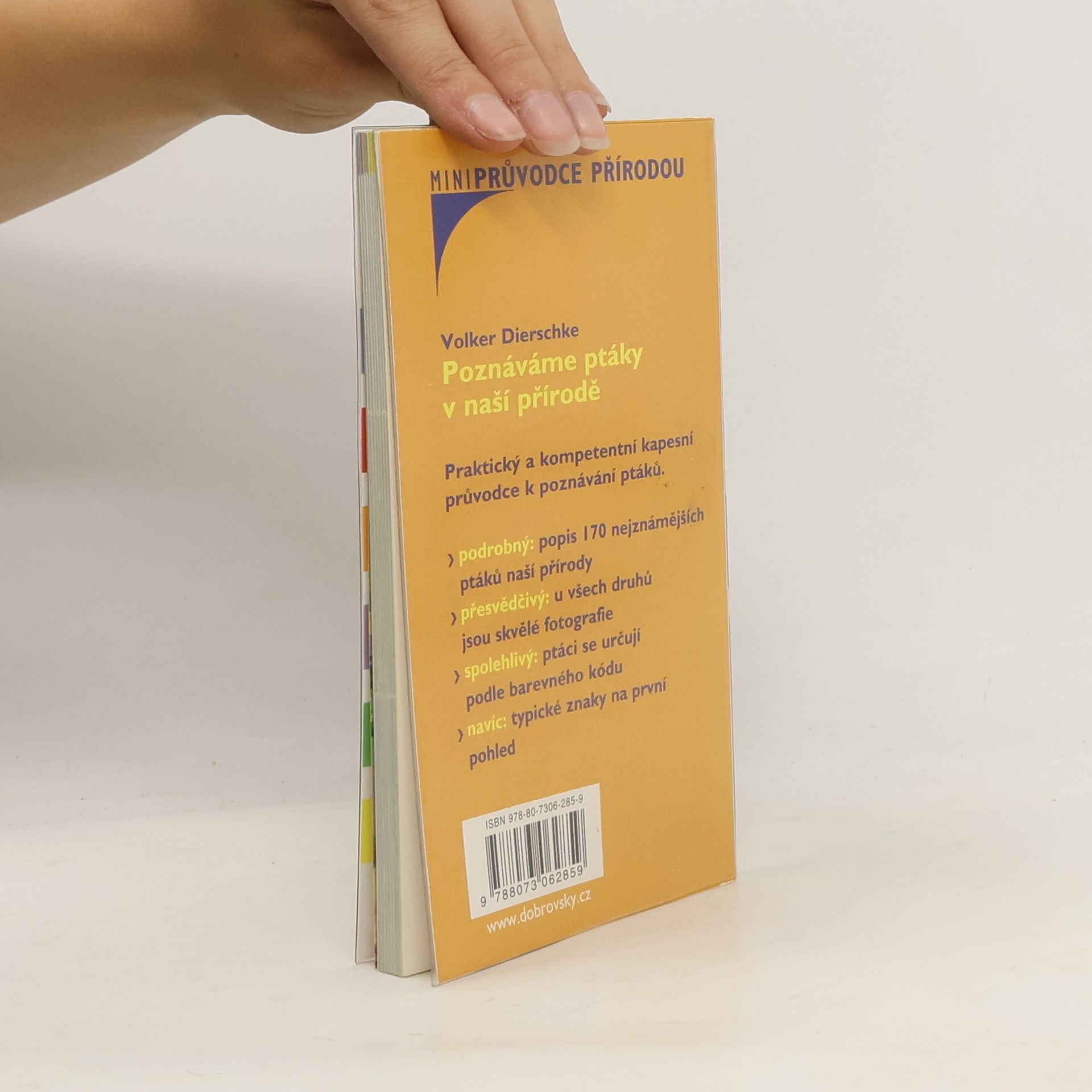 Praktický a kompetentní kapesní průvodce k poznávání ptáků. Podrobný popis: 170 nejzajímavějších ptáků naší přírody. Přesvědčivý: u všech druhů jsou skvělé fotografie. Spolehlivý: ptáci se určují podle barevného kódu. Navíc: typické znaky na první pohled. Rozměry i hmotnost a připravenost posloužit ve skutečně „polních“ podmínkách jen podtrhují užitečnost a praktičnost průvodce při výpravách v přírodě. Přeložil Jiří Ševčík.