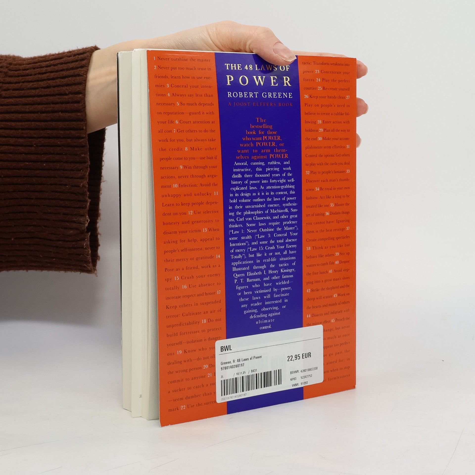 Amoral, cunning, ruthless, and instructive, this multi-million-copy New York Times bestseller is the definitive manual for anyone interested in gaining, observing, or defending against ultimate control – from the author of The Laws of Human Nature. This is the only authorized paperback edition in the US. In the book that People magazine proclaimed “beguiling” and “fascinating,” Robert Greene and Joost Elffers have distilled three thousand years of the history of power into 48 essential laws by drawing from the philosophies of Machiavelli, Sun Tzu, and Carl Von Clausewitz and also from the lives of figures ranging from Henry Kissinger to P.T. Barnum. Some laws teach the need for prudence (“Law 1: Never Outshine the Master”), others teach the value of confidence (“Law 28: Enter Action with Boldness”), and many recommend absolute self-preservation (“Law 15: Crush Your Enemy Totally”). Every law, though, has one thing in common: an interest in total domination. In a bold and arresting two-color package, The 48 Laws of Power is ideal whether your aim is conquest, self-defense, or simply to understand the rules of the game.