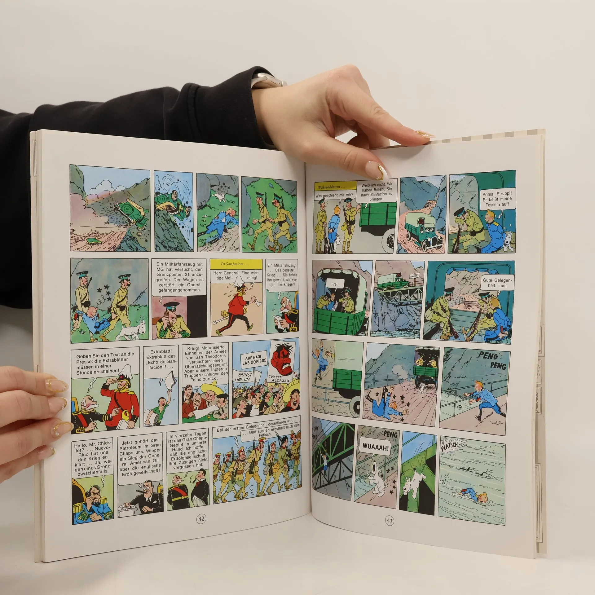 Tolle Abenteuer für Leseanfänger Diebstahl im Völkerkunde-Museum! Doch kaum wurde der hölzerne Fetisch der Ureinwohner von Arumbaya von unbekannten Tätern entwendet, da steht er auch schon wieder unversehrt an seinem Platz. War das Ganze ein Scherz? Tim mag nicht daran glauben. In der Wohnung des ermordeten Bildhauers Balthasar findet er Hinweise auf eine Verschwörung, die ihn bis nach Südamerika führen. In der vom Bürgerkrieg erschütterten Republik San Theodoros gerät er zwischen alle Fronten... Ein Comic-Klassiker für Kinder und Erwachsene Die Comichefte von Tim und Struppi sind klassische Abenteuergeschichten, die für Kinder ab 8 Jahren geeignet sind. Sie sind spannend, fantasievoll und deshalb auch für Erstleser zum Lesen lernen genau das Richtige. Auf der ganzen Welt lesen Kinder die Abenteuer von Tim und Struppi, eine der bekanntesten Comic-Serien überhaupt. Seit über 90 Jahren begeistern Tim und seine Freunde Leser aller Altersklassen, die gespannt verfolgen, wie Tim, Struppi, Kapitän Haddock, Professor Bienlein oder Schultze und Schulze fiesen Typen das Handwerk legen. Wie flucht Käpt'n Haddock immer so gern? Mast- und Schotbruch! Auf ins Abenteuer!