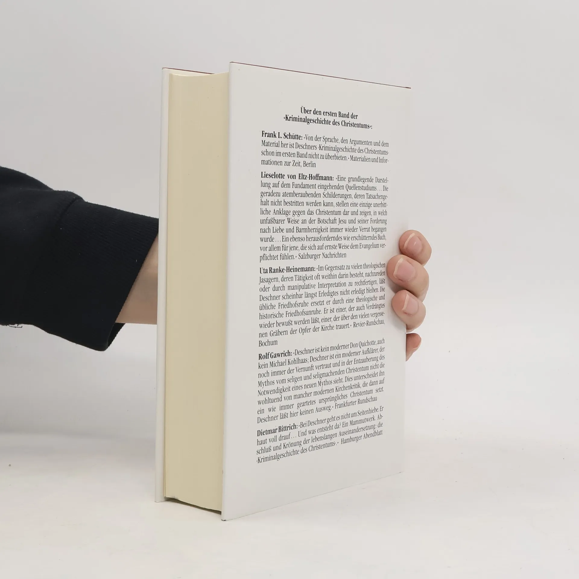 «Im Gegensatz zu vielen theologischen Jasagern, dernen Tätigkeit oft weithin darin besteht, nachzureden oder durch manipulative Interpretation zu rechtfertigen, lässt Deschner scheinbar längst Erledigtes nicht erledigt bleiben. Die übliche Friedhofsruhe ersetzt er durch eine theologische und historische Friedhofsruhe. Er ist einer, der auch Verdrängtes wieder bewusst werden lässt, einer, der über den vielen vergessenen Gräbern der Opfer der Kirche trauert.» (Uta Ranke-Heinemann)