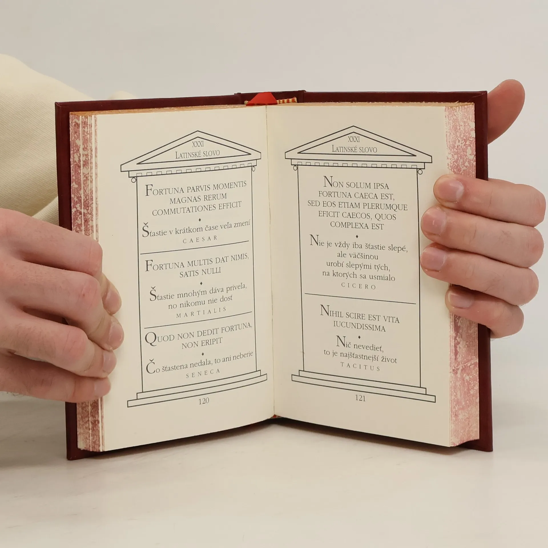 Výber populárnych latinských výrokov rímskych a gréckych autorov. Doplnený o slovenský preklad. Originálna ručná umelecká knihárska práca.