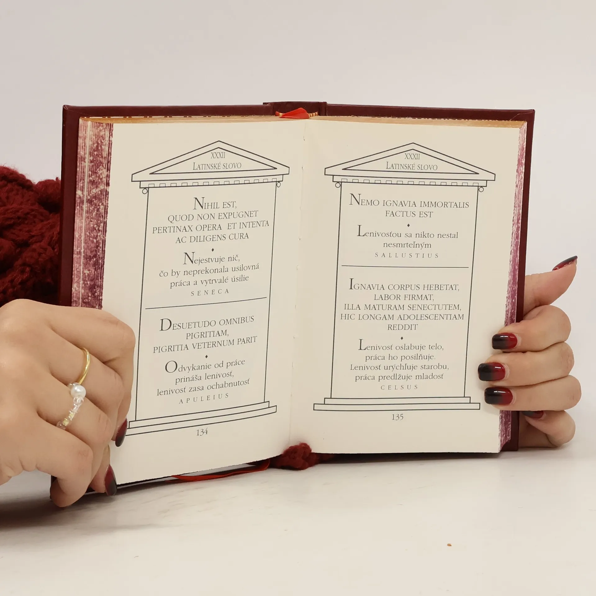 Výber populárnych latinských výrokov rímskych a gréckych autorov. Doplnený o slovenský preklad. Originálna ručná umelecká knihárska práca.