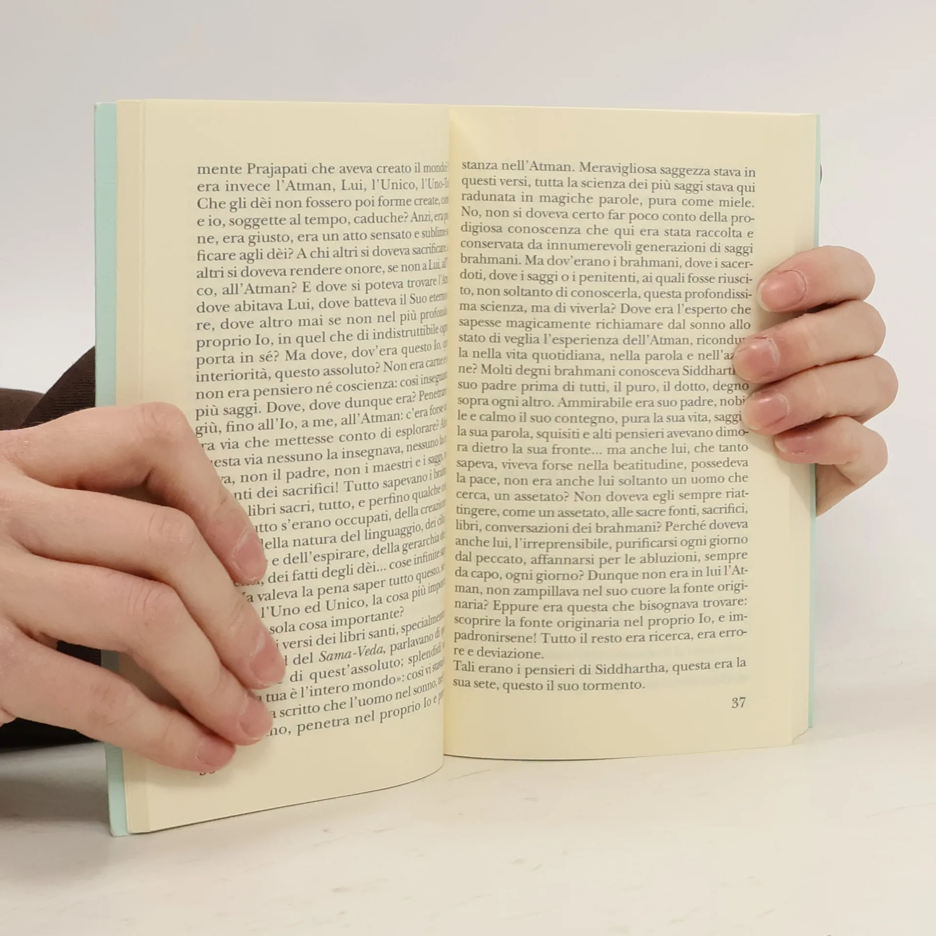 Chi è Siddhartha? È uno che cerca, e cerca soprattutto di vivere intera la propria vita. Passa di esperienza in esperienza, dal misticismo alla sensualità, dalla meditazione filosofica alla vita degli affari, e non si ferma presso nessun maestro, non considera definitiva nessuna acquisizione, perché ciò che va cercato è il tutto, il misterioso tutto che si veste di mille volti cangianti. E alla fine quel tutto, la ruota delle apparenze, rifluirà dietro il perfetto sorriso di Siddharta, che ripete il «costante, tranquillo, fine, impenetrabile, forse benigno, forse schernevole, saggio, multirugoso sorriso di Gotama, il Buddha, quale egli stesso l’aveva visto centinaia di volte con venerazione».