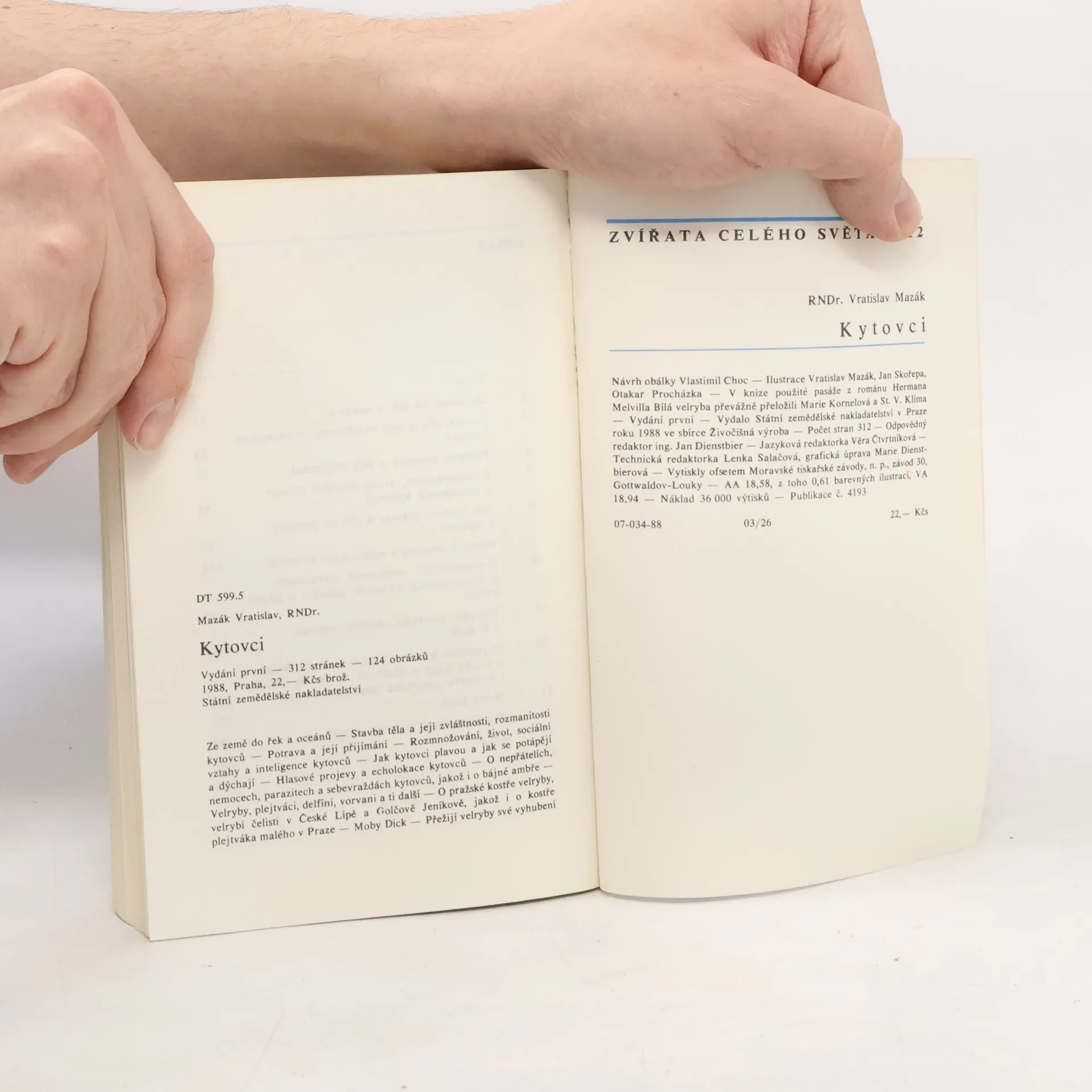 Základní informace o životě kytovců a výčet všech dnes žijících druhů včetně jejich vyobrazení. Obsahuje rovněž informace o velrybářství, skutečném Moby Dickovi, a kostech kytovců v československých muzejních sbírkách. Nejrozsáhlejší svazek edice, jak textově, tak obrazově, aby českému čtenáři poskytl poněkud hlubší pohled na tvory, které nemá možnost běžně vídat. Ilustrace autor, množství fotografií a archivních obrázků. 07-034-88