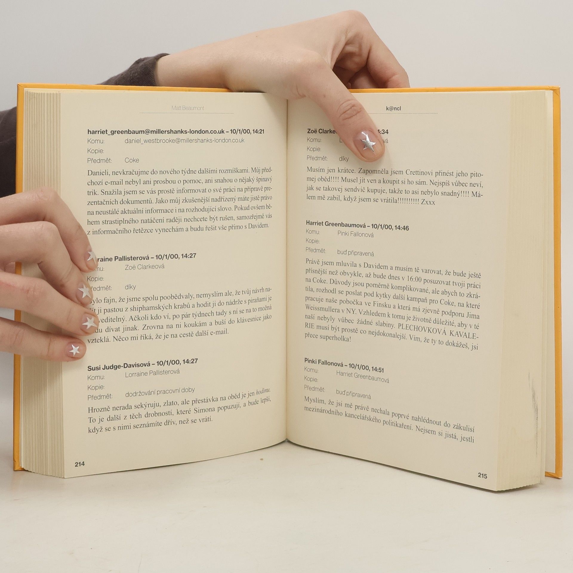 Pracovali jste někdy v reklamní agentuře? I když otázka by měla vlastně znít takto – pracovali jste někdy v nějaké firmě, v níž se značná část vzájemné komunikace odehrává po e-mailu? Pokud ano, pak budete mít při čtení humoristického románu Matta Beaumonta až podezřele povědomý pocit... Nad Beaumontovou knihou, sestávající výhradně z e-mailů mezi zaměstnanci reklamní agentury, vás budou napadat stísňující otázky. Jsou opravdu všichni CEO megalomani a sociopati, žijící zřejmě na jiné planetě než obyčejný lid? A proč se ty nejdůležitější e-maily vždy dostanou do nesprávných rukou? A jsou naši IT kolegové skutečně lidské bytosti? Na tyto a podobné otázky si ale v zájmu zachování zdravého rozumu a blahé nevědomosti neodpovídejte. Místo toho se pokochejte mistrovským líčením nejrůznějších podpásovek, které si dělají kolegové ve firmě, jež se té vaší podobá jen čistě náhodně.