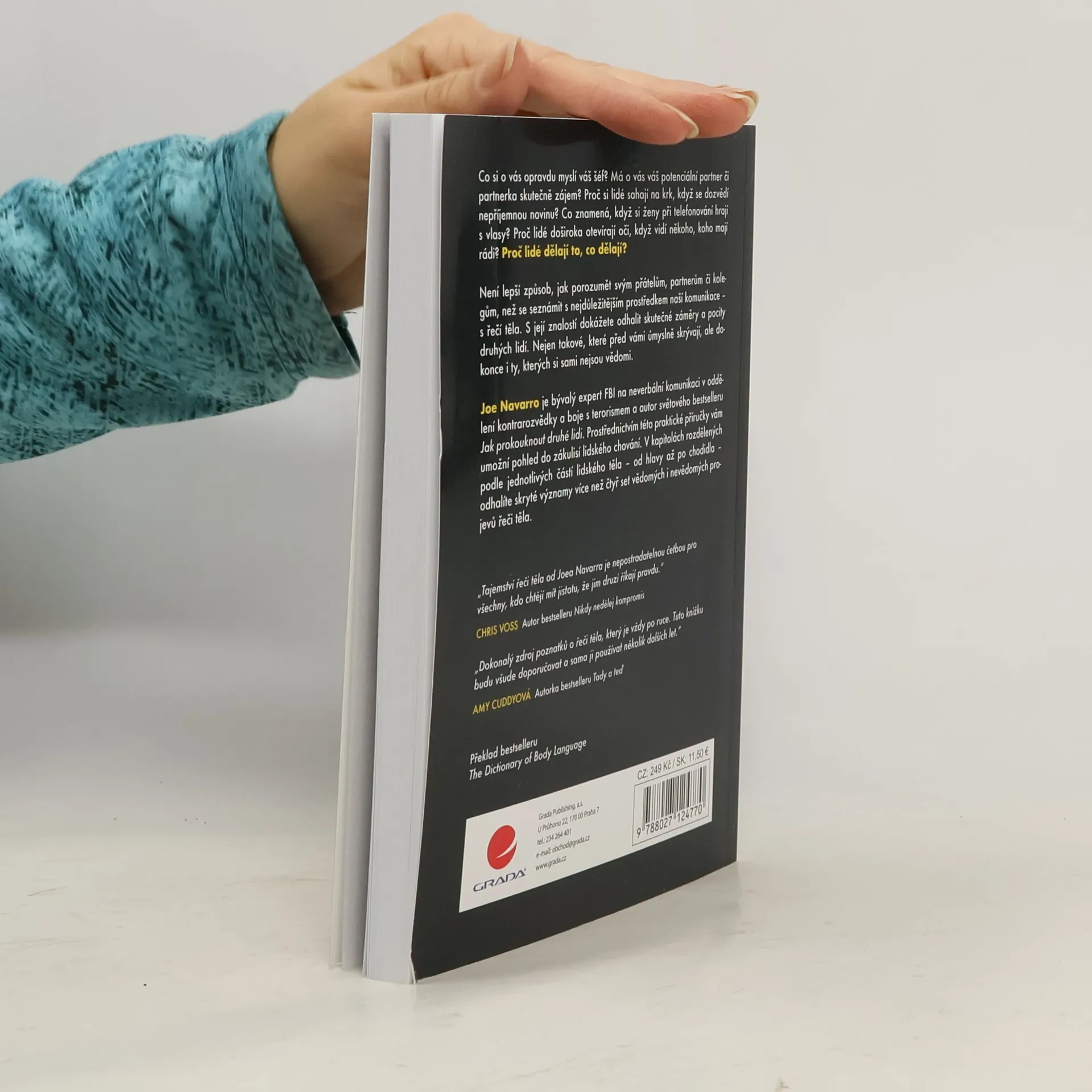 • Co si o vás opravdu myslí váš šéf? • Má o vás váš potenciální partner či partnerka skutečně zájem? • Proč si lidé sahají na krk, když se dozví nepříjemnou novinu? • Co znamená, když si ženy při telefonování hrají s vlasy? • Proč lidé doširoka otevírají oči, když vidí někoho, koho mají rádi? Proč lidé dělají to, co dělají? Není lepší způsob, jak porozumět svým přátelům, partnerům či kolegům, než se seznámit s nejdůležitějším prostředkem naší komunikace – s řečí těla. S její znalostí dokážete odhalit skutečné záměry a pocity druhých lidí. Nejen takové, které před vámi úmyslně skrývají, ale dokonce i ty, kterých si sami nejsou vědomi. Joe Navarro je bývalý expert FBI na neverbální komunikaci v oddělení kontrarozvědky a boje s terorismem a autor světového bestselleru Jak prokouknout druhé lidi. Prostřednictvím této praktické příručky vám umožní pohled do zákulisí lidského chování. V kapitolách rozdělených podle jednotlivých částí lidského těla – od hlavy až po chodidla – odhalíte skryté významy více než čtyř set vědomých i nevědomých projevů řeči těla.