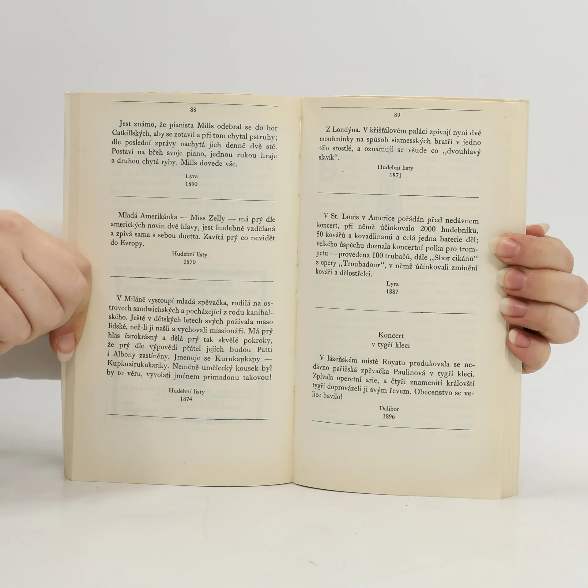 Publikace obsahuje drobné zprávy, anekdoty, kritiky, polemiky, fejetony a krátké povídky, vybrané z českých hudebních časopisů druhé poloviny minulého století. Mozaiku uspořádala a komentářem doprovodila Olga Zuckerová.
